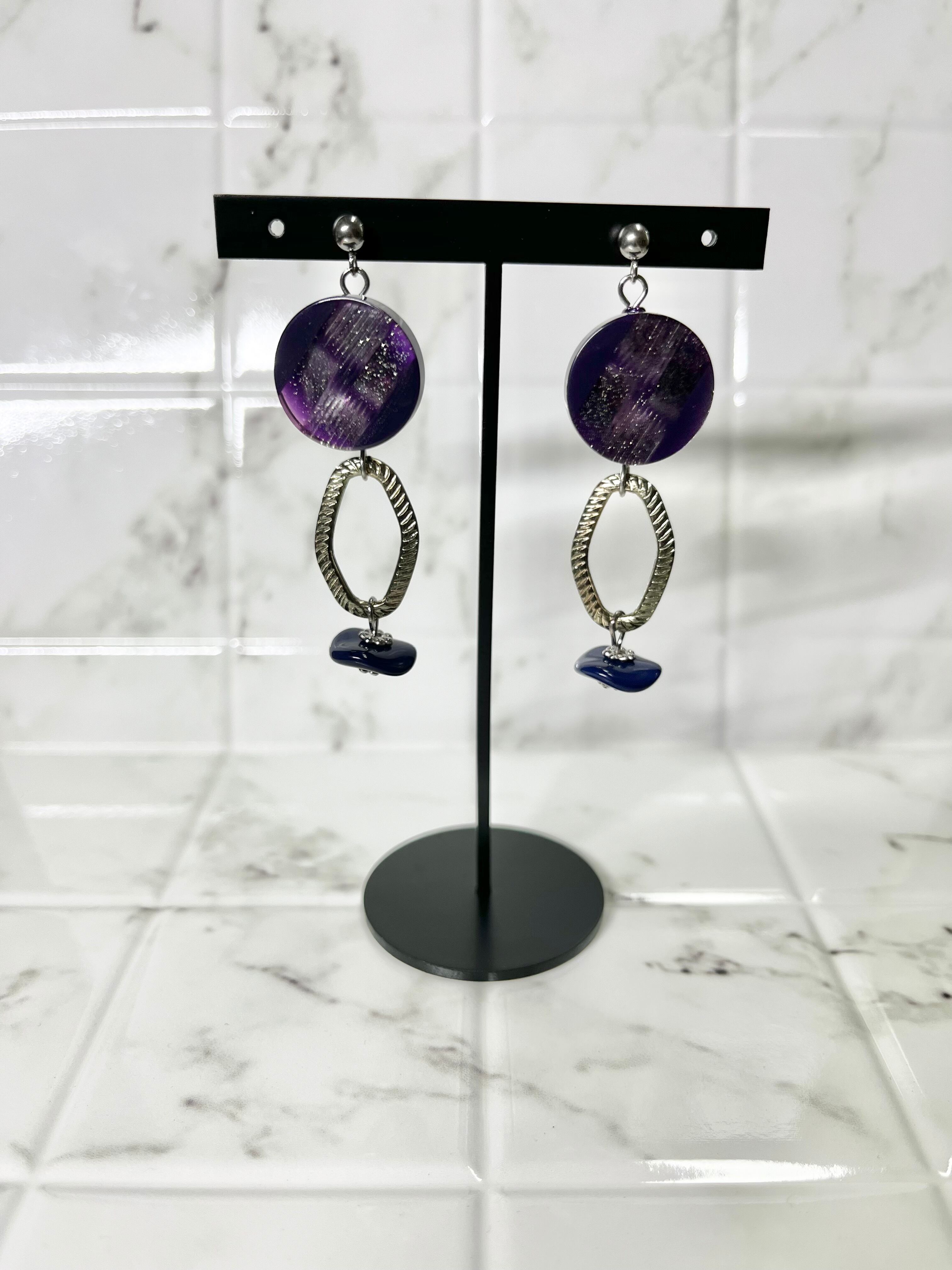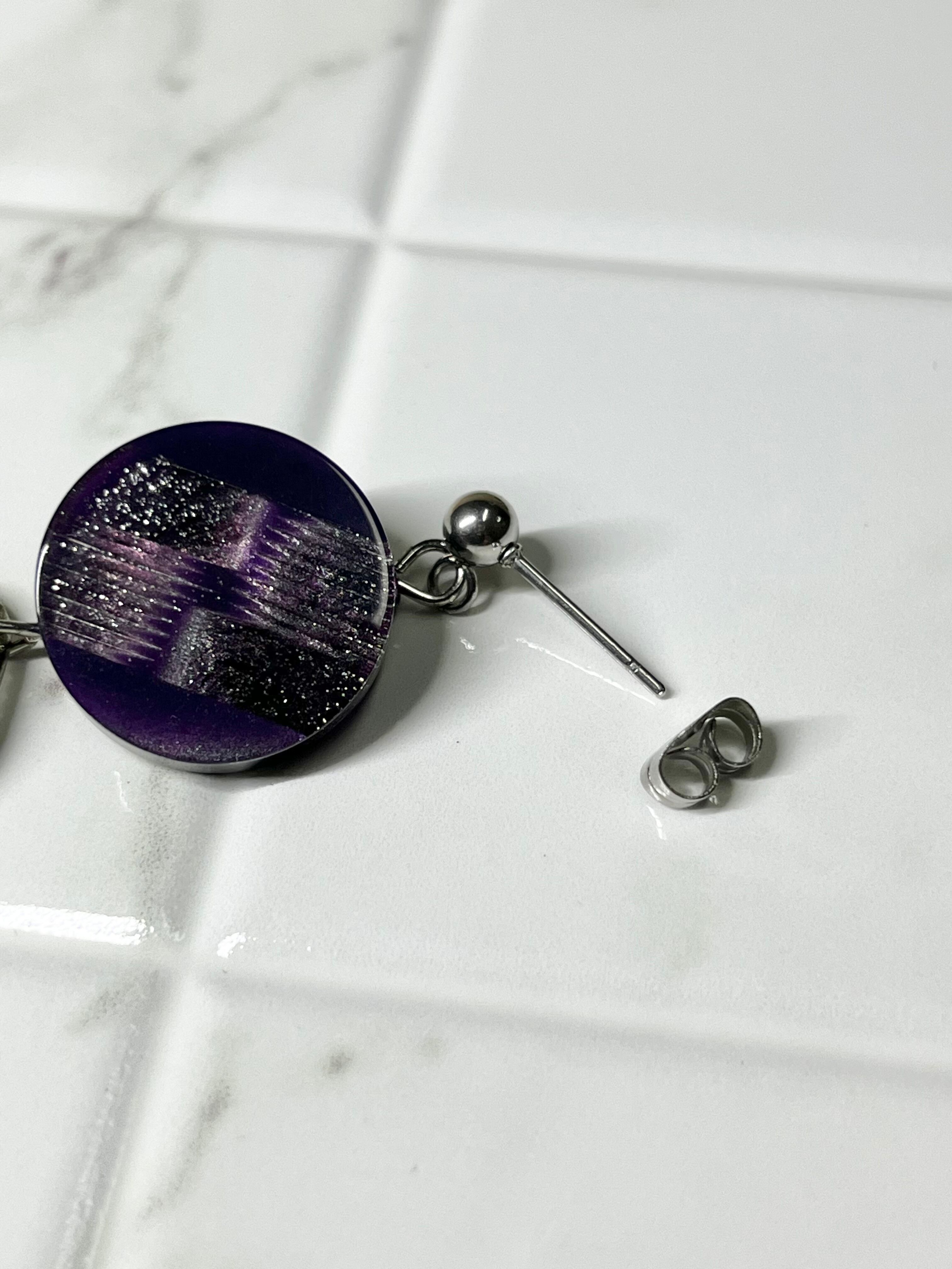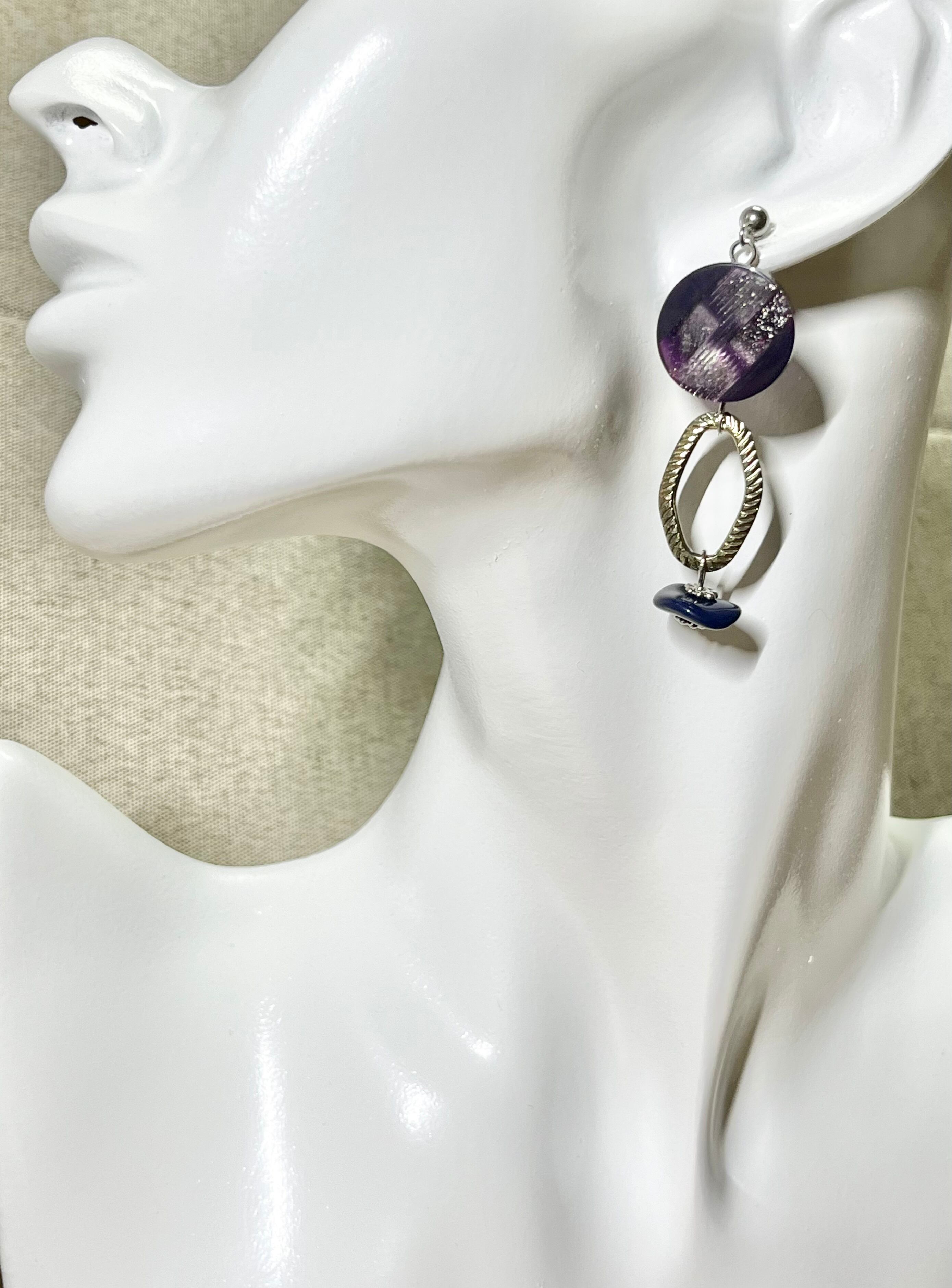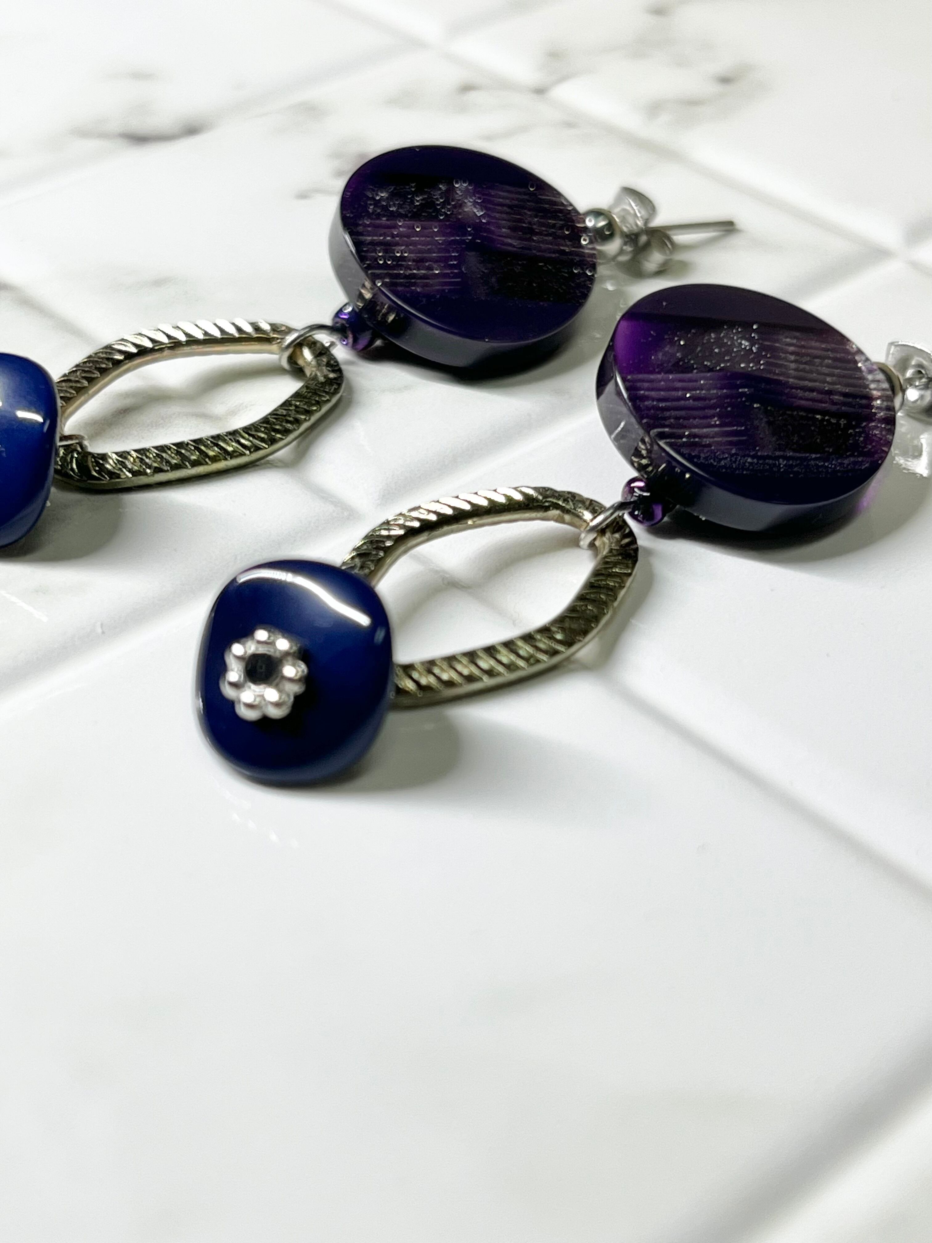 優美なパープルのボタンが主役の魅力的なデザインのピアスです。光の加減によってラメがキラキラと煌めき、アンティークシルバーのメタリックなチェーンパーツがスパイスとなっています。ネイビーのチェコビーズが引き締め役となり、どんなファッションにもマッチします。