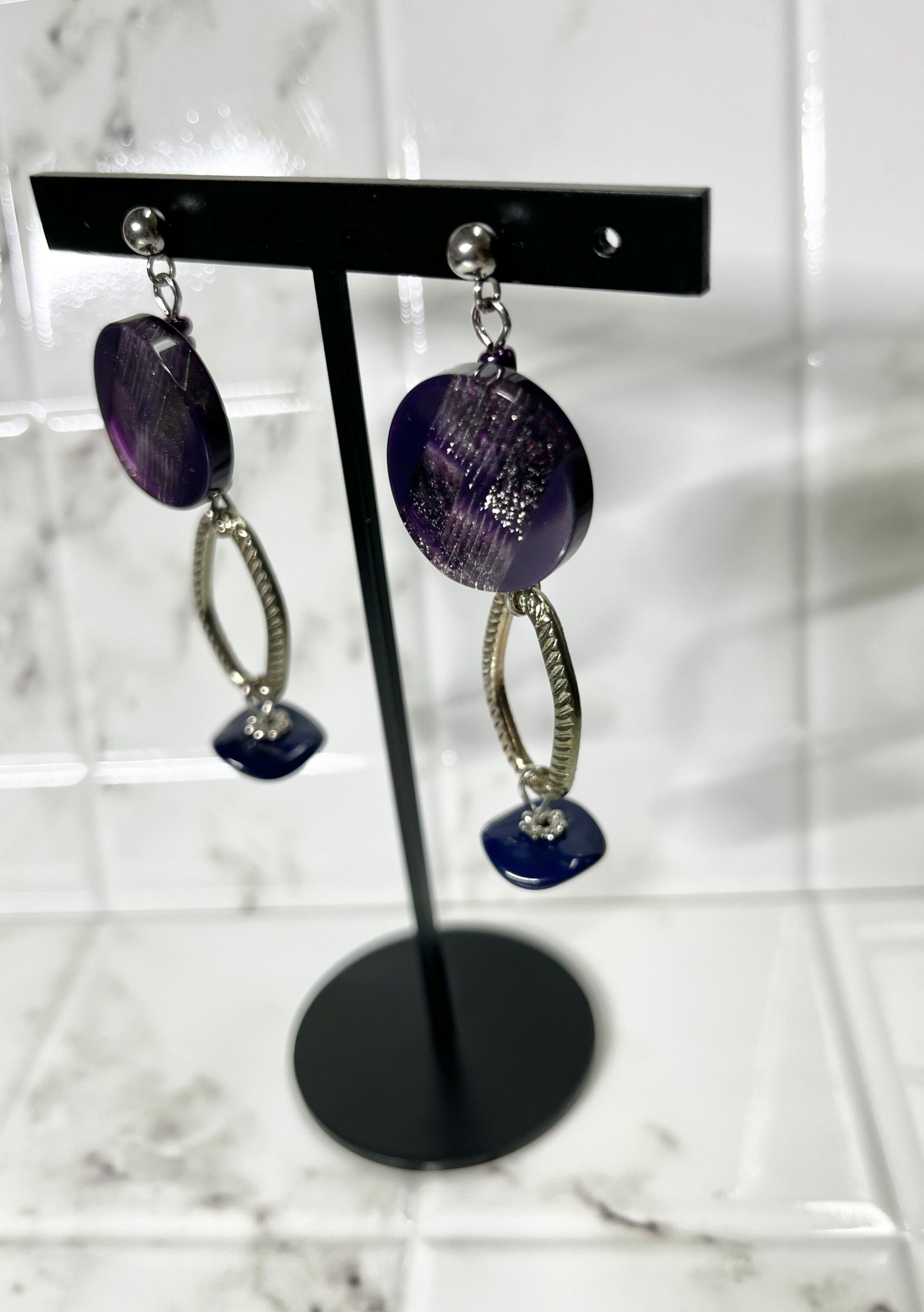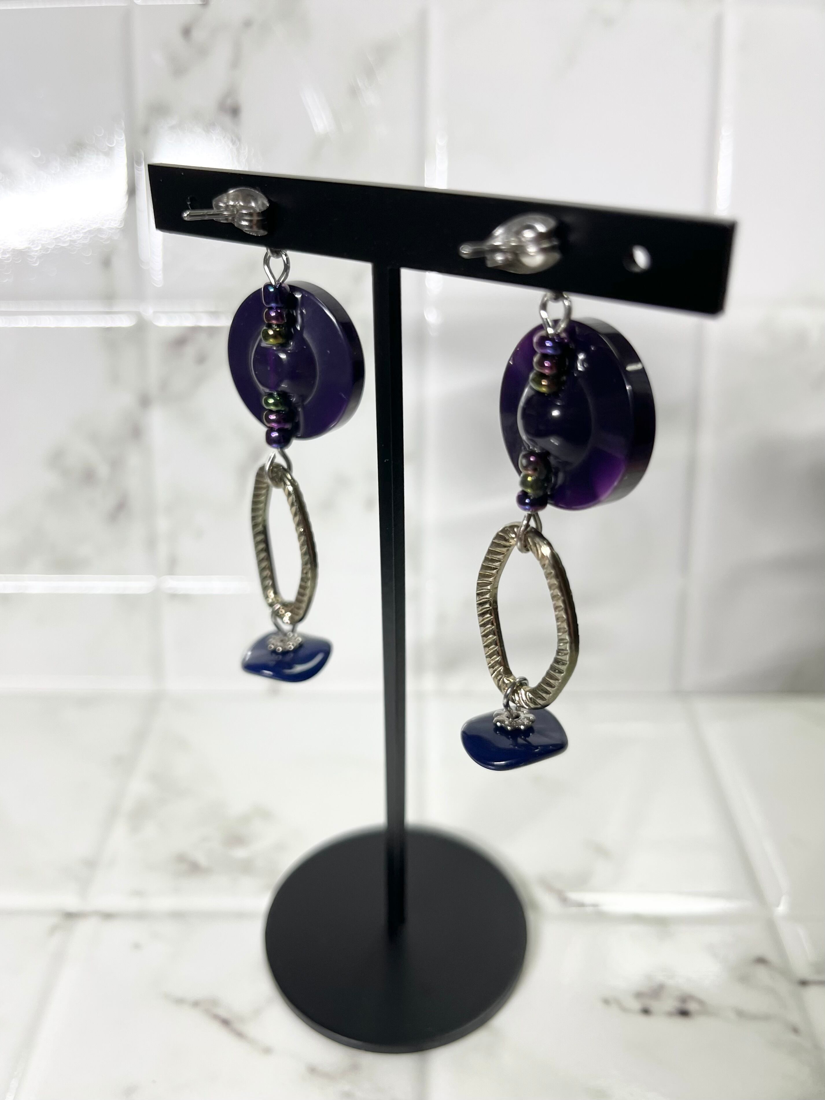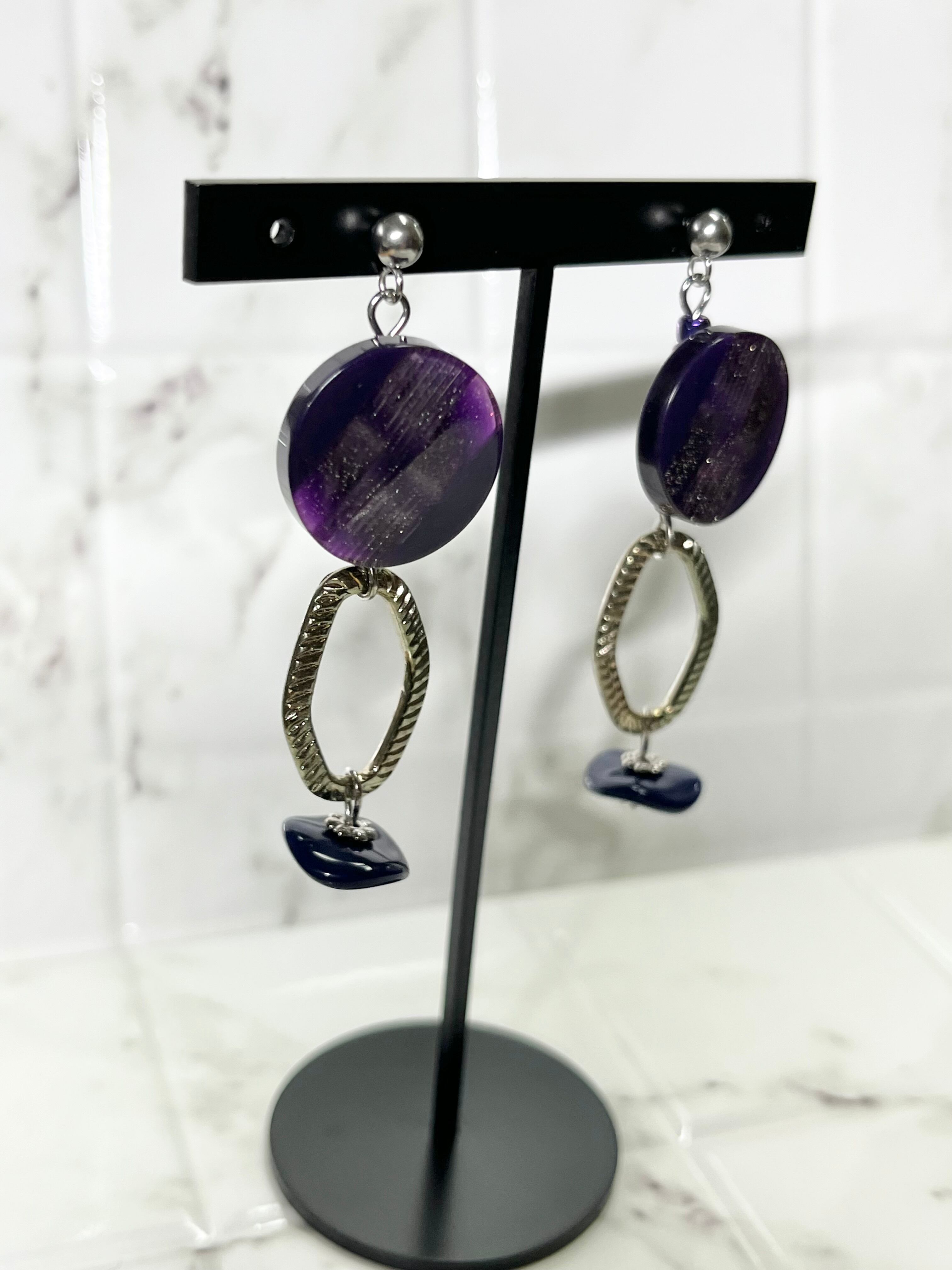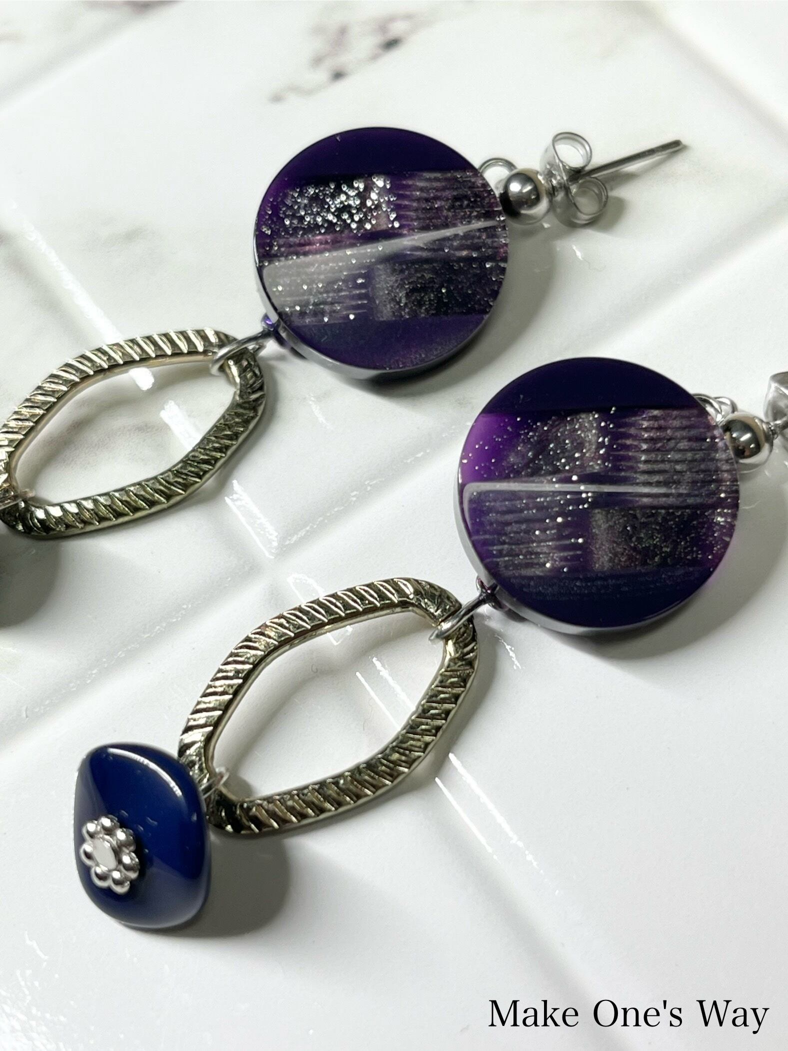優美なパープルのボタンが主役の魅力的なデザインのピアスです。光の加減によってラメがキラキラと煌めき、アンティークシルバーのメタリックなチェーンパーツがスパイスとなっています。ネイビーのチェコビーズが引き締め役となり、どんなファッションにもマッチします。