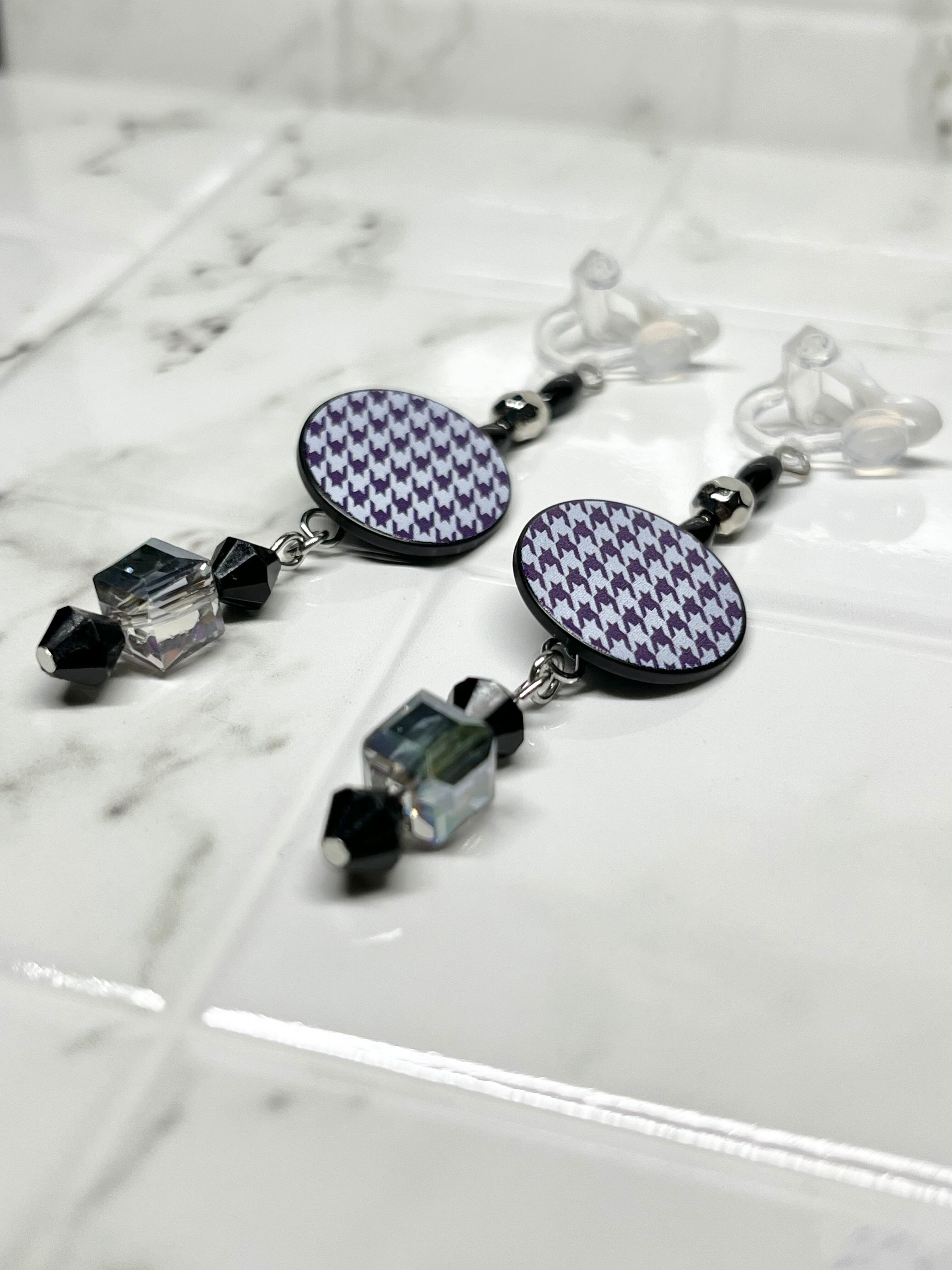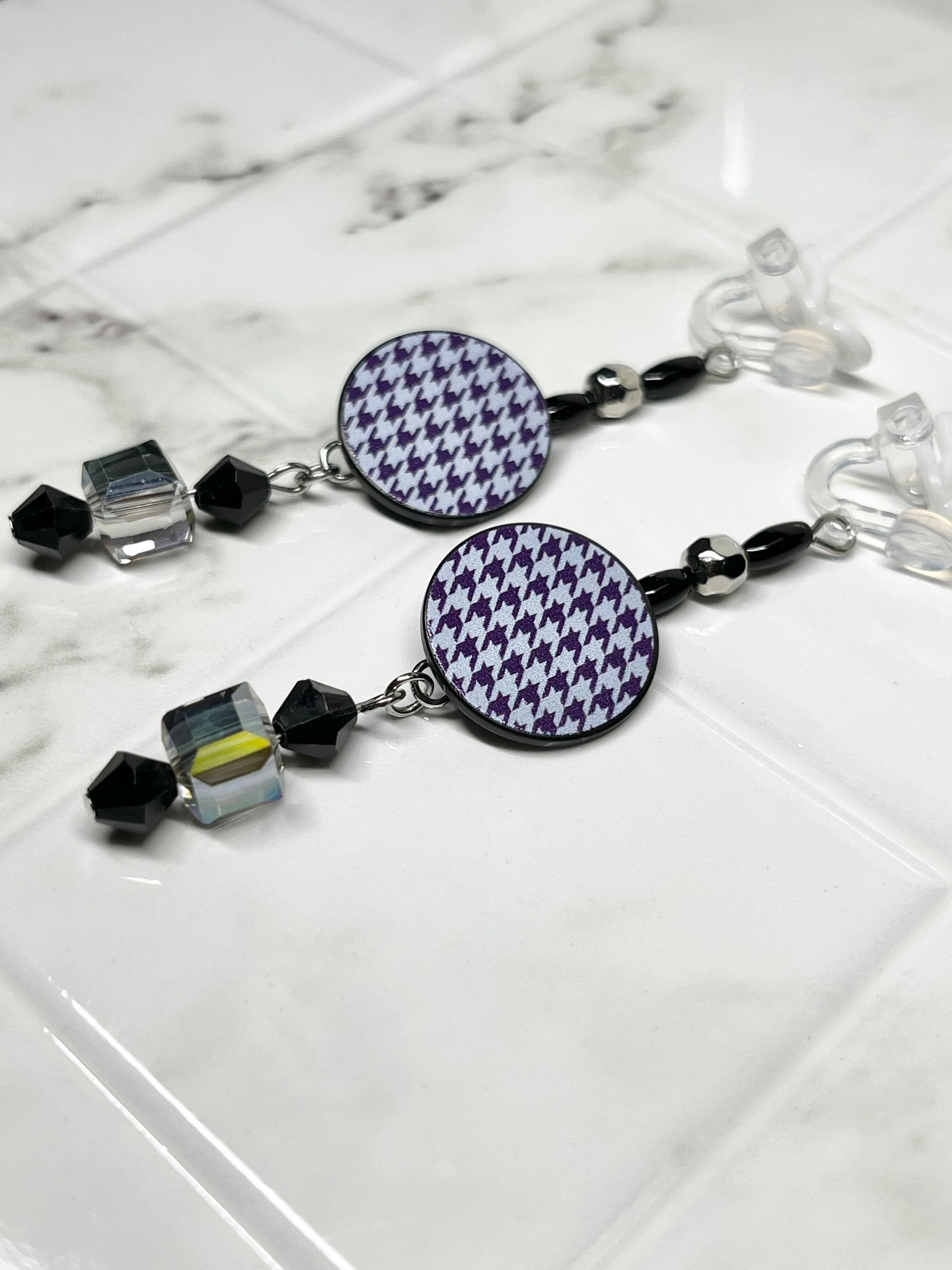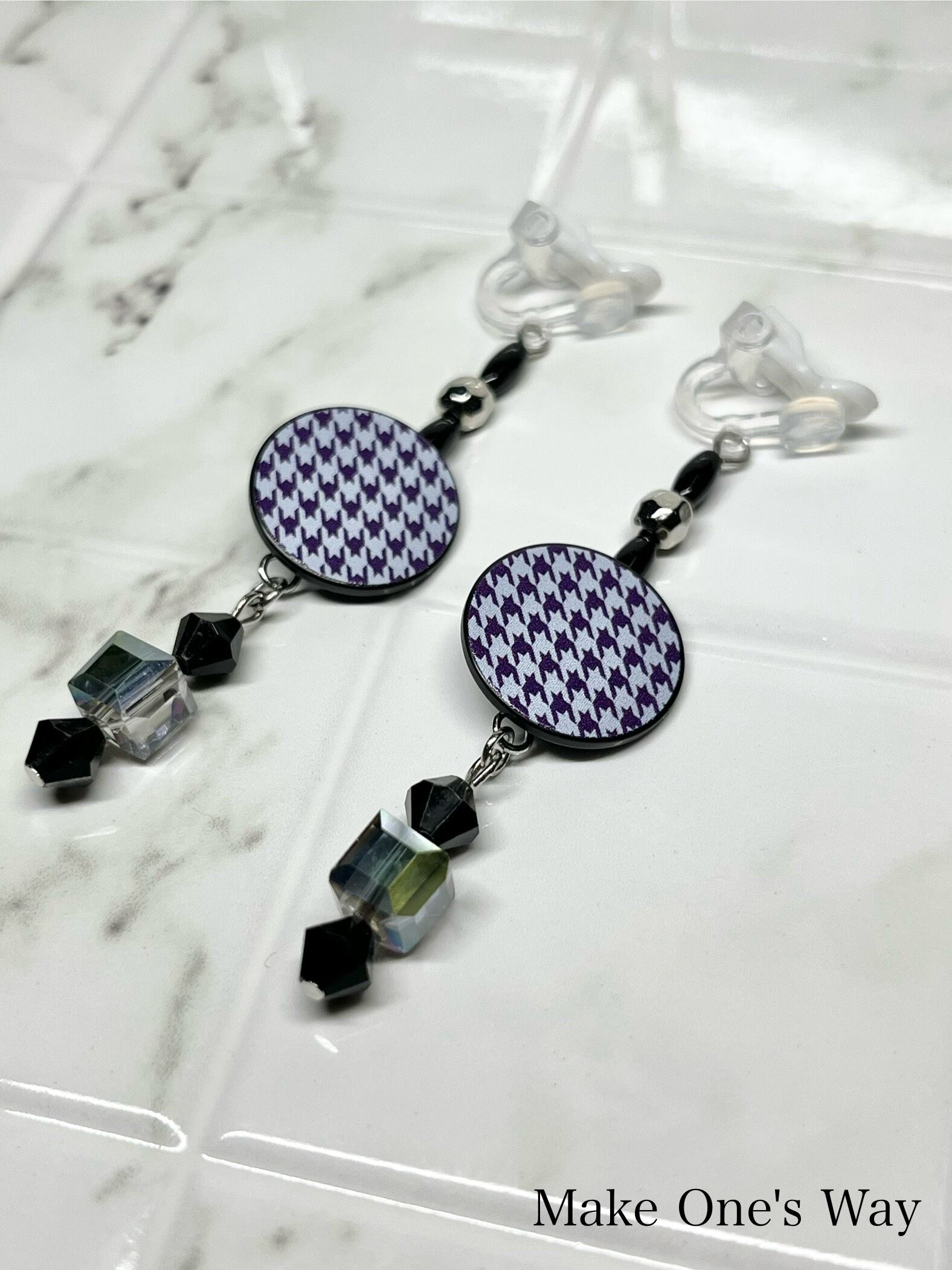 シックな千鳥柄ボタンと光の加減でオーロラのような輝きを放つスクエア型ビーズが特徴のイヤリング。ブラックのビーズが加わる事でさり気なく洗練された印象を与え、コーディネートのアクセントにぴったり。