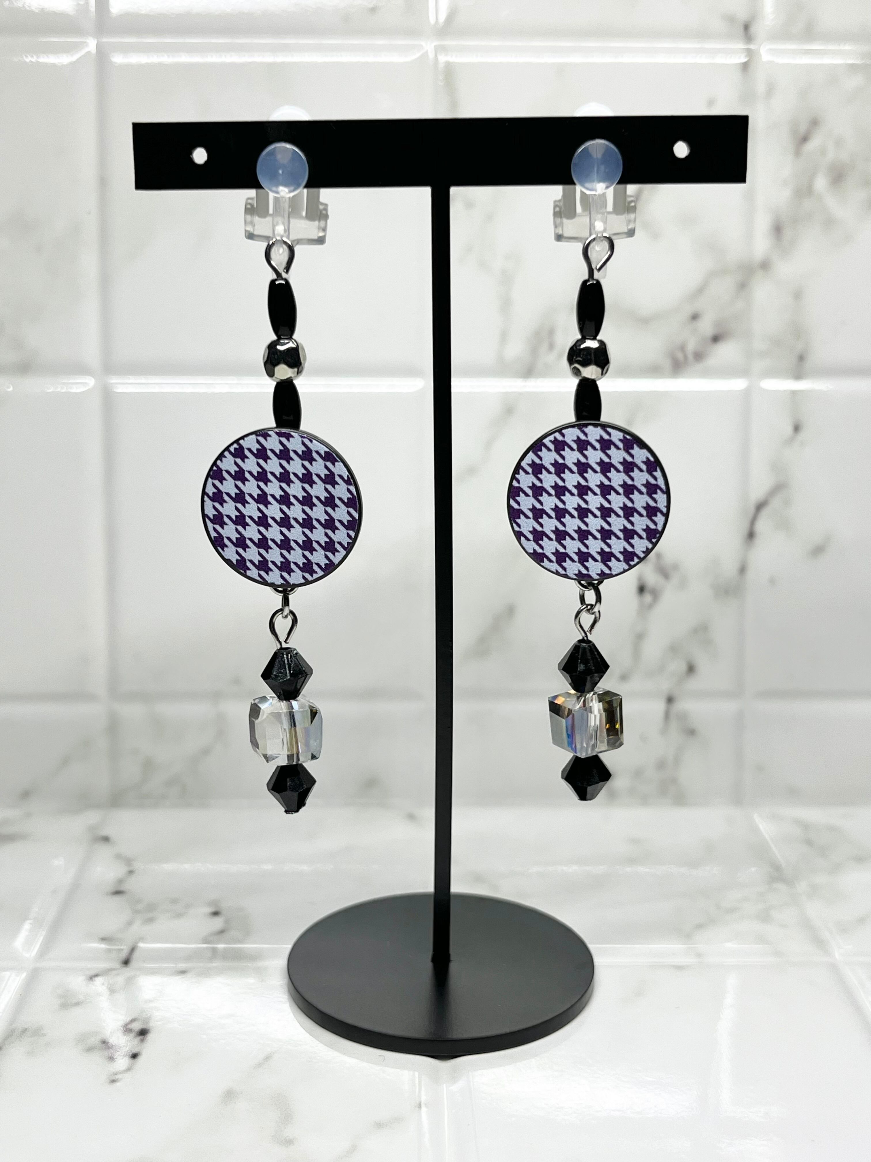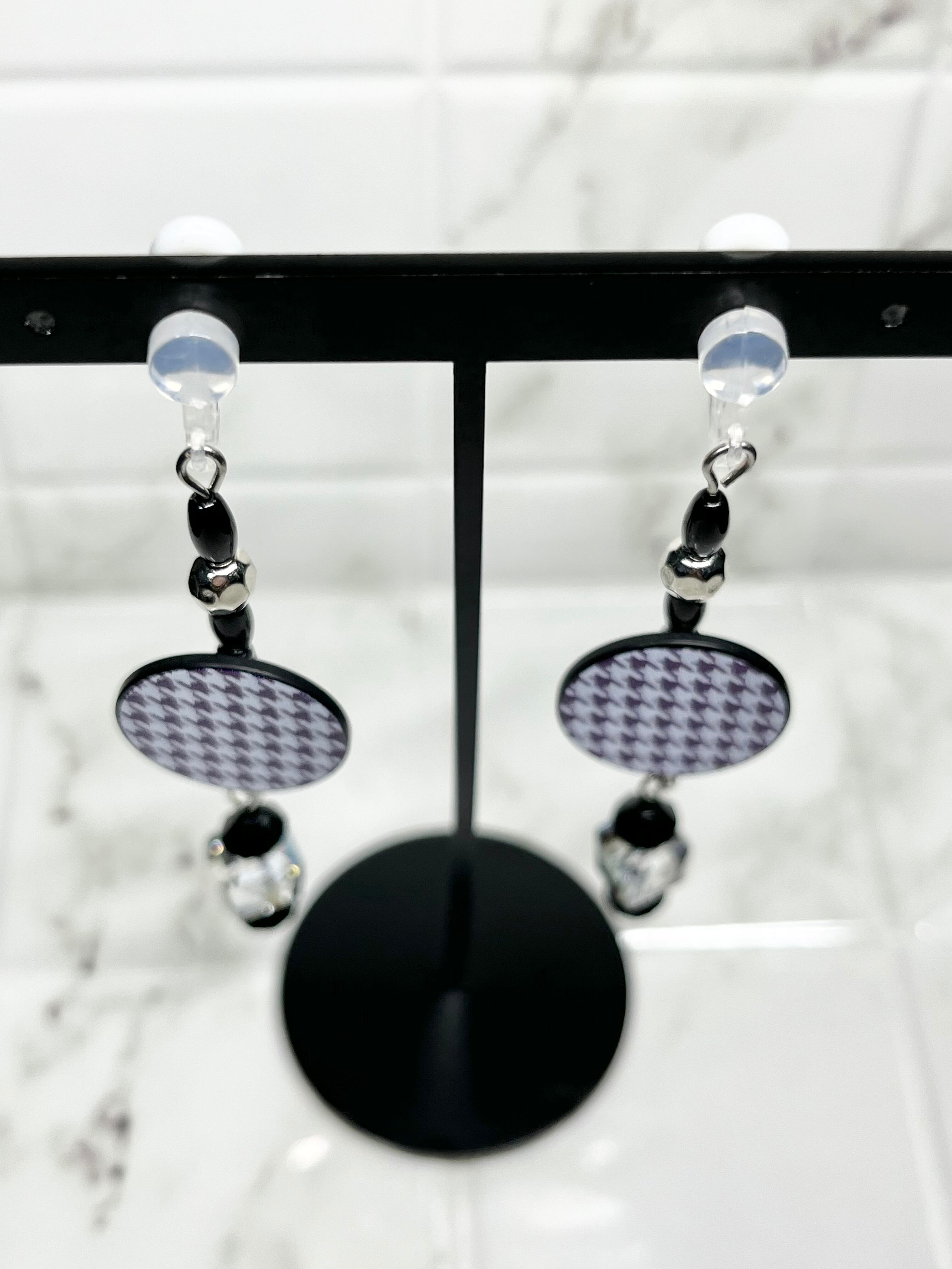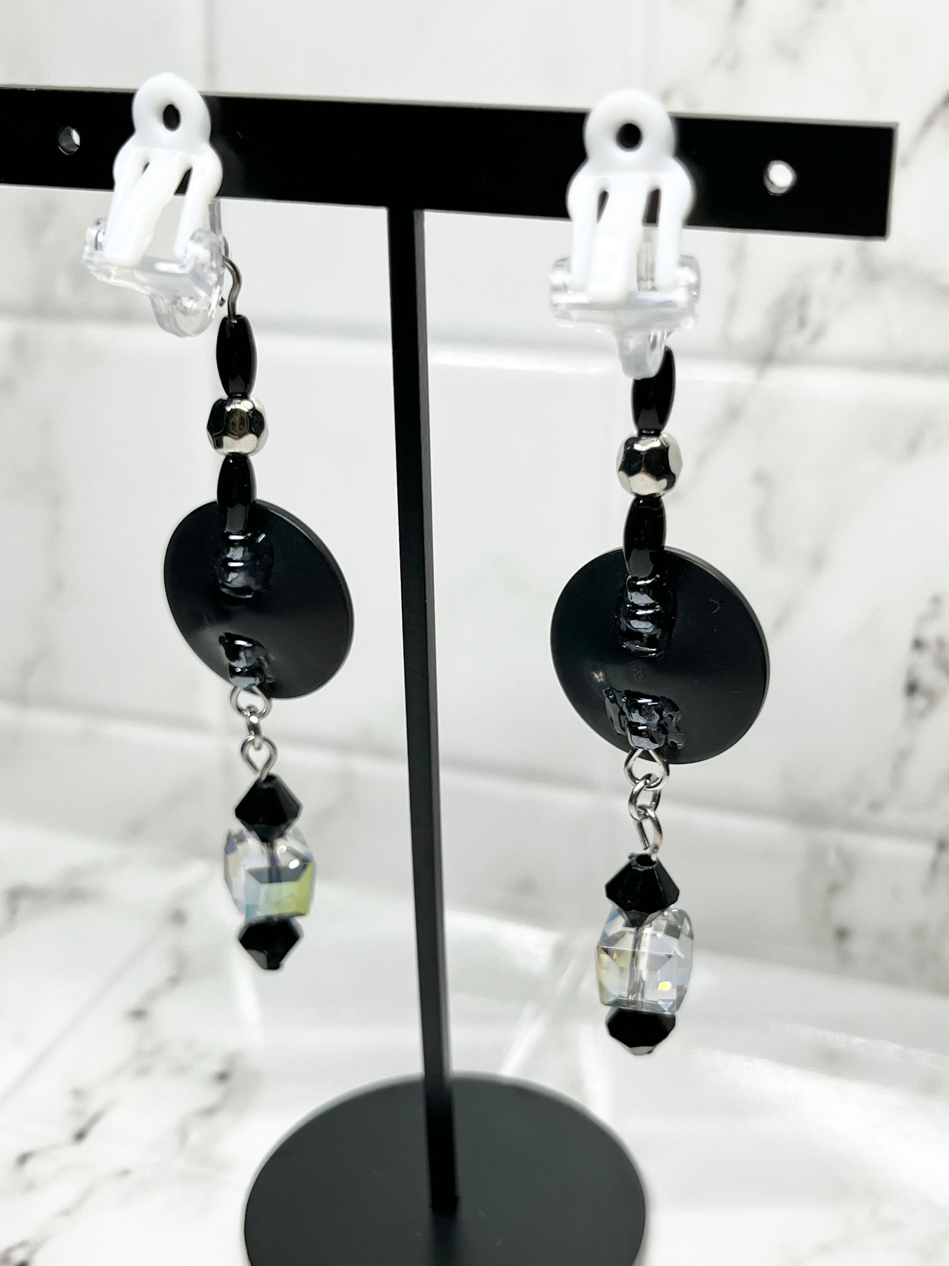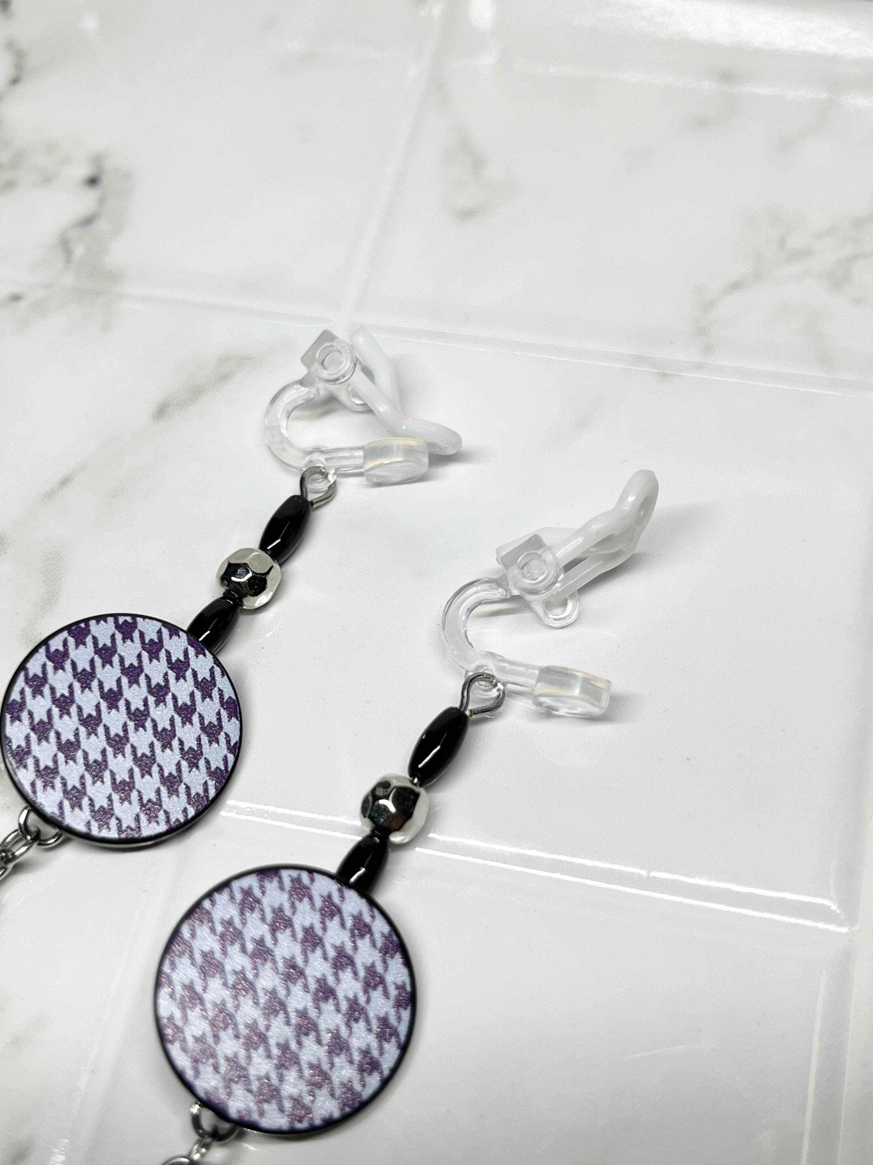 シックな千鳥柄ボタンと光の加減でオーロラのような輝きを放つスクエア型ビーズが特徴のイヤリング。ブラックのビーズが加わる事でさり気なく洗練された印象を与え、コーディネートのアクセントにぴったり。