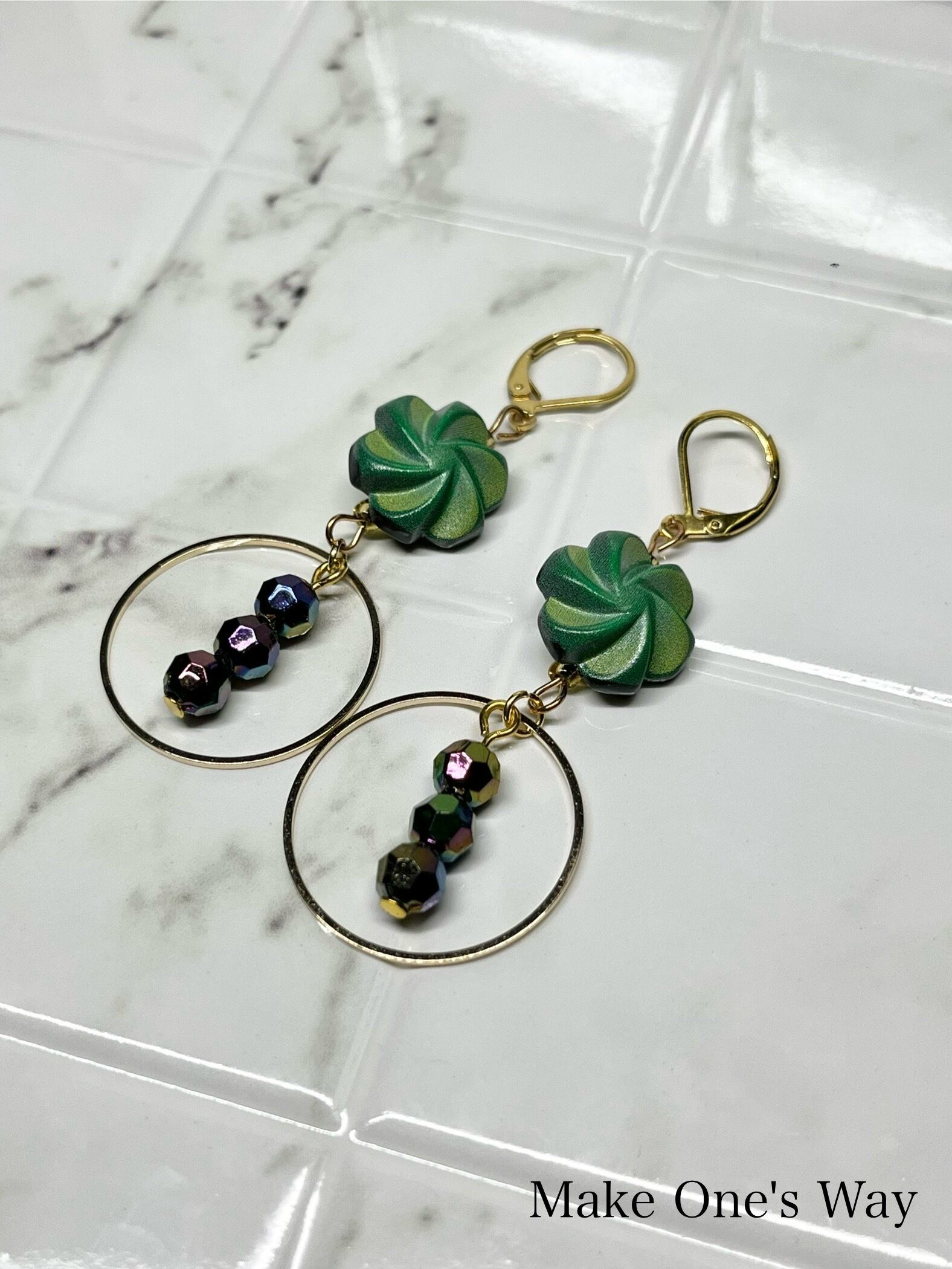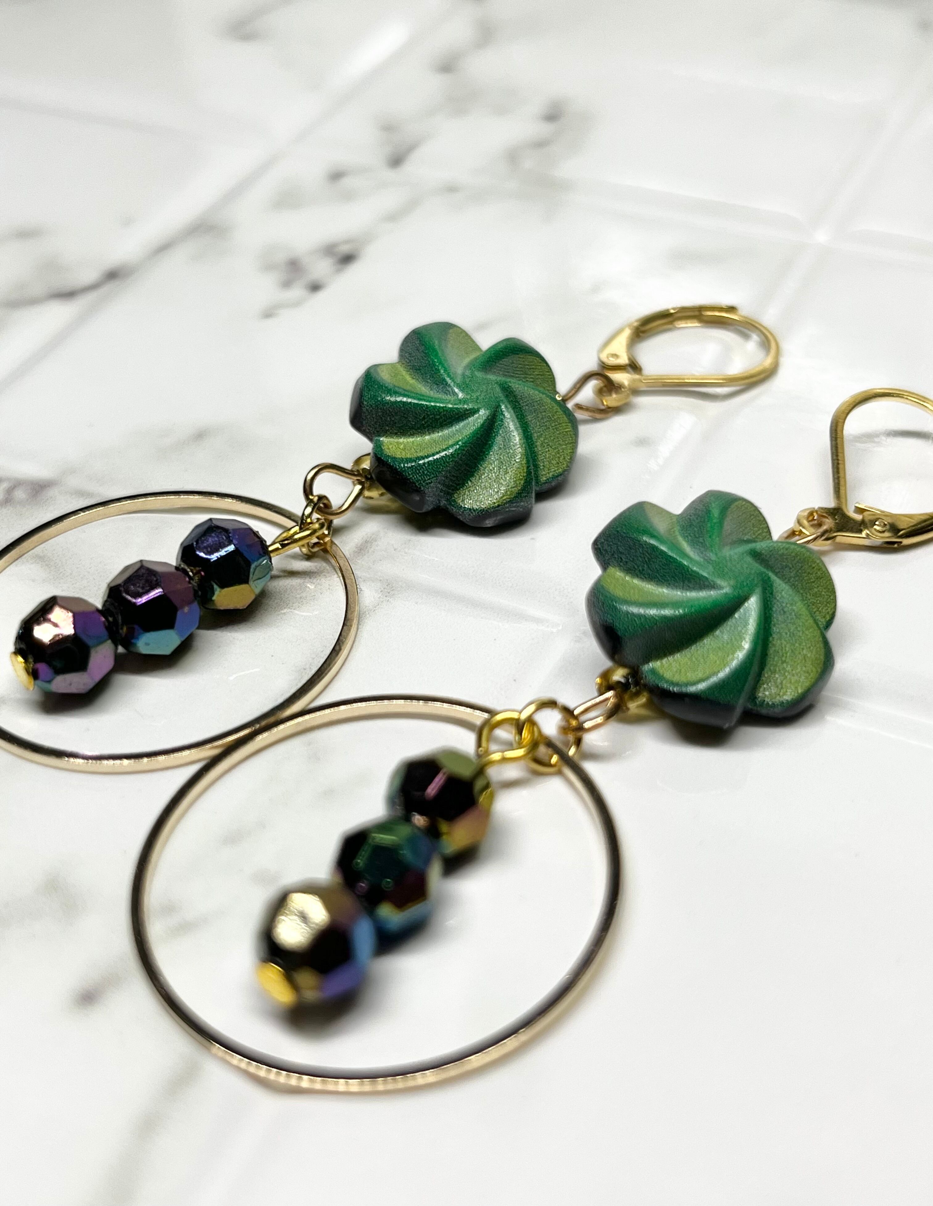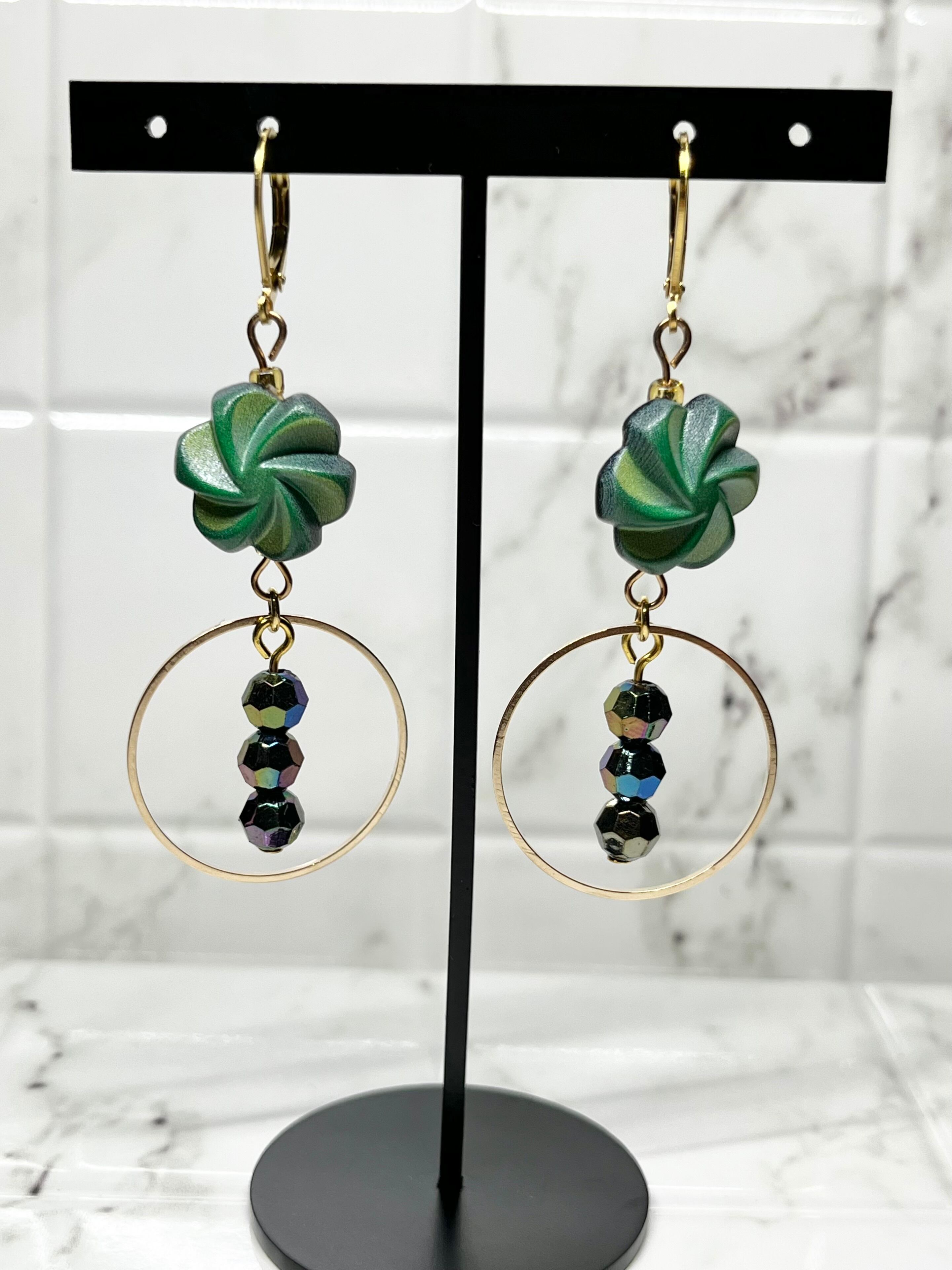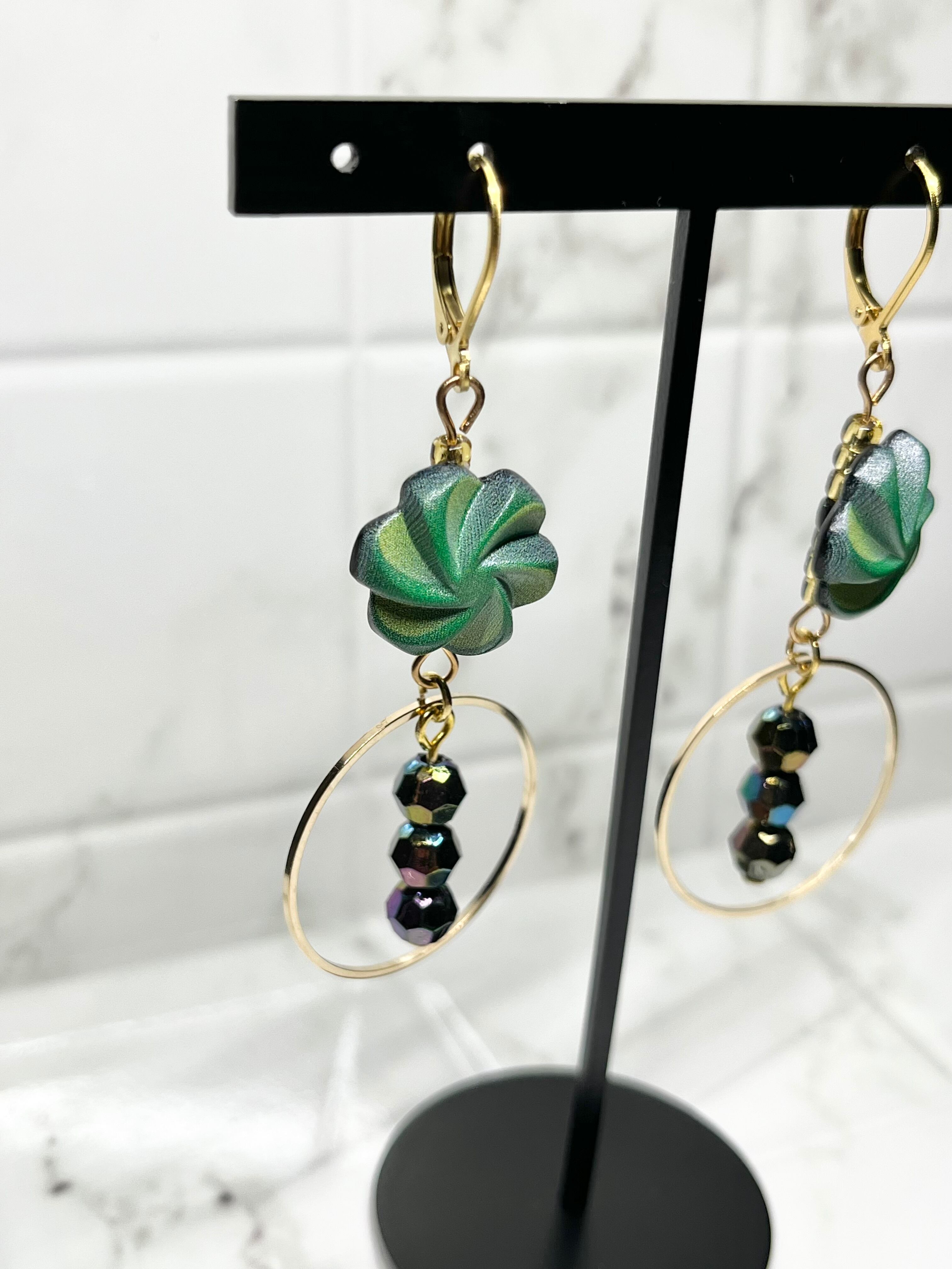 清々しい風が吹く季節にピッタリのピアス。グリーンのフラワーモチーフボタンとゴールドパーツの組み合わせが、爽やかさと程良いゴージャス感を演出します。さらに、光の加減によって煌めく色が変化する多面体ビーズがアクセントに。