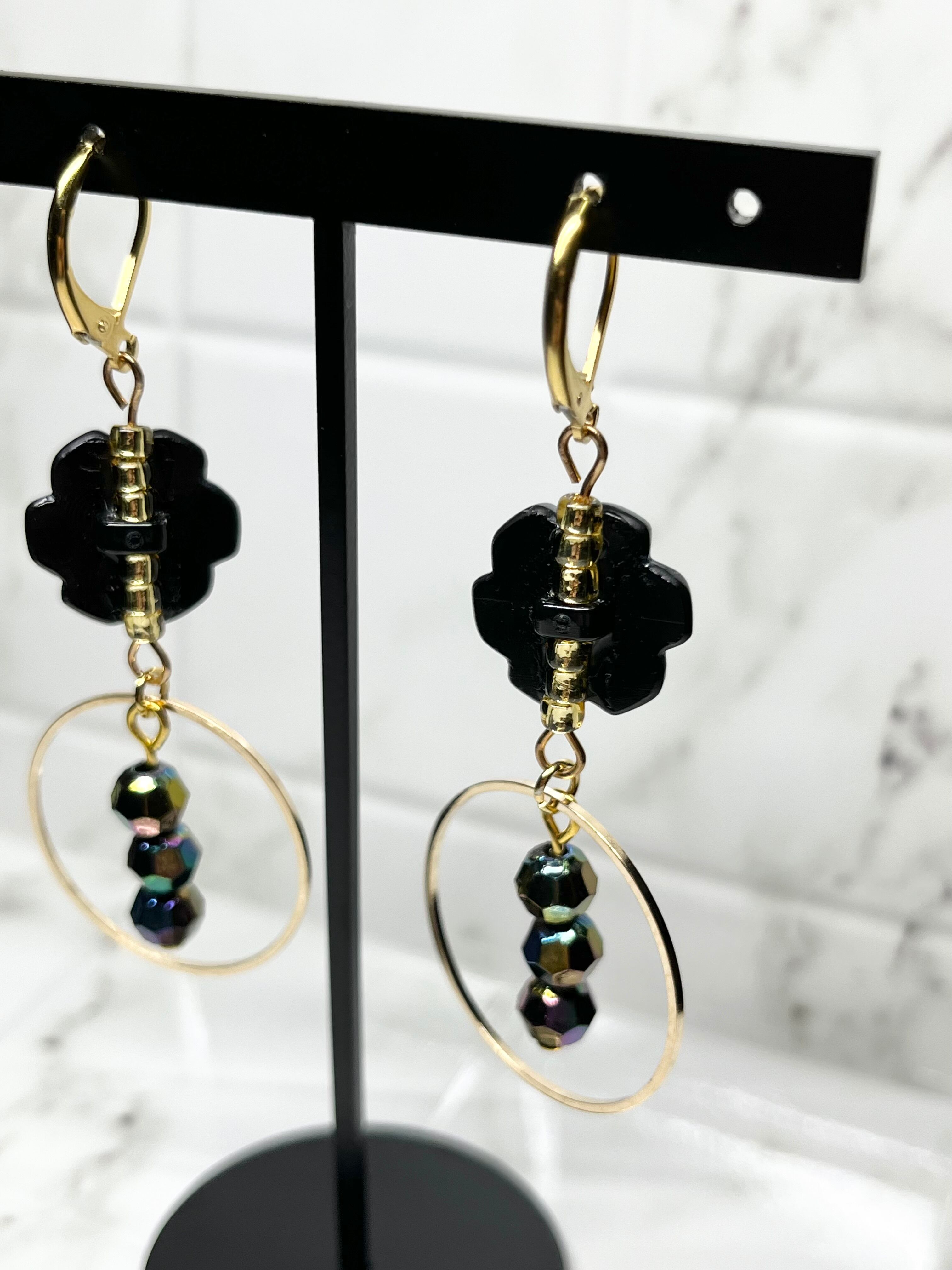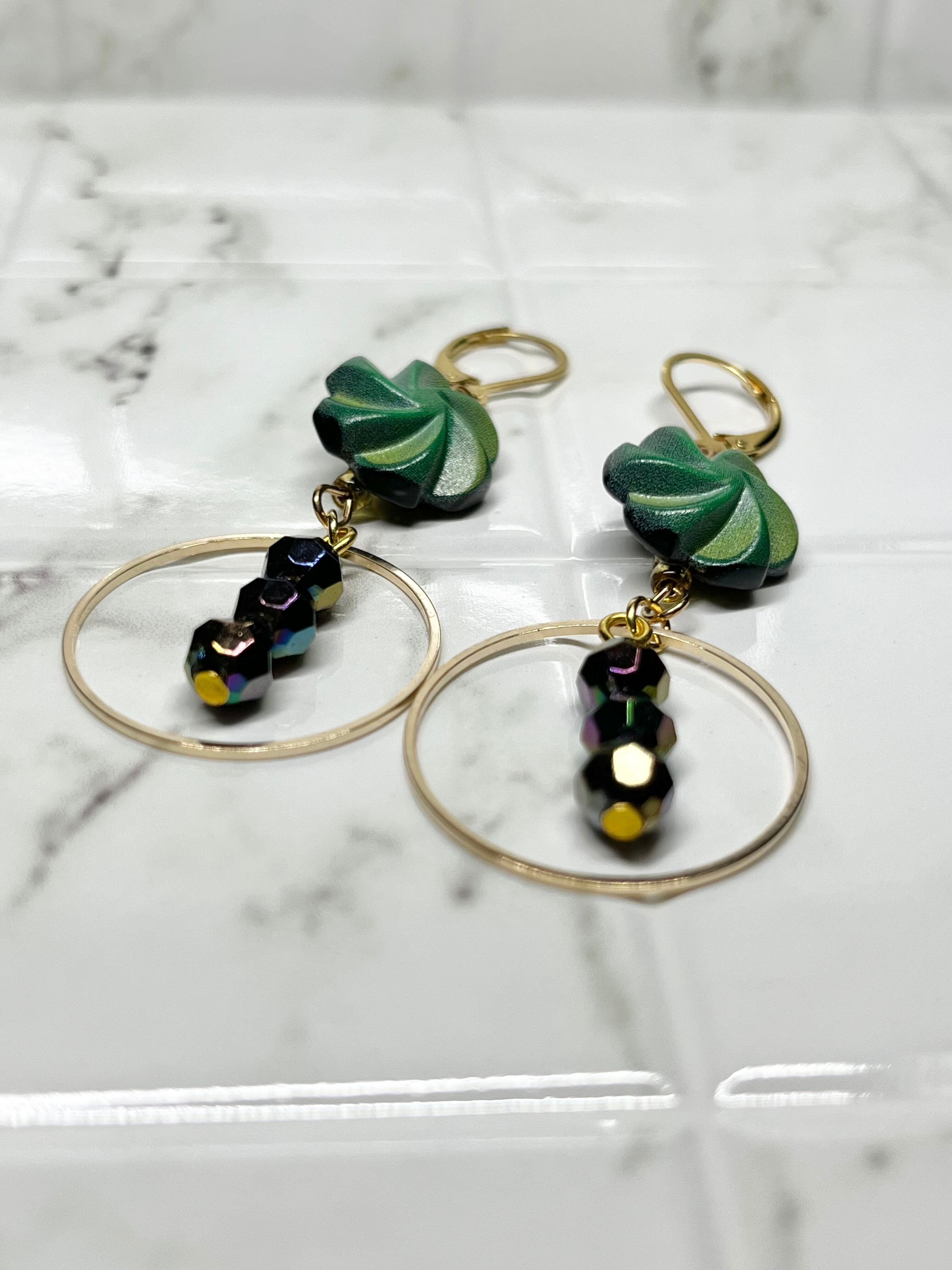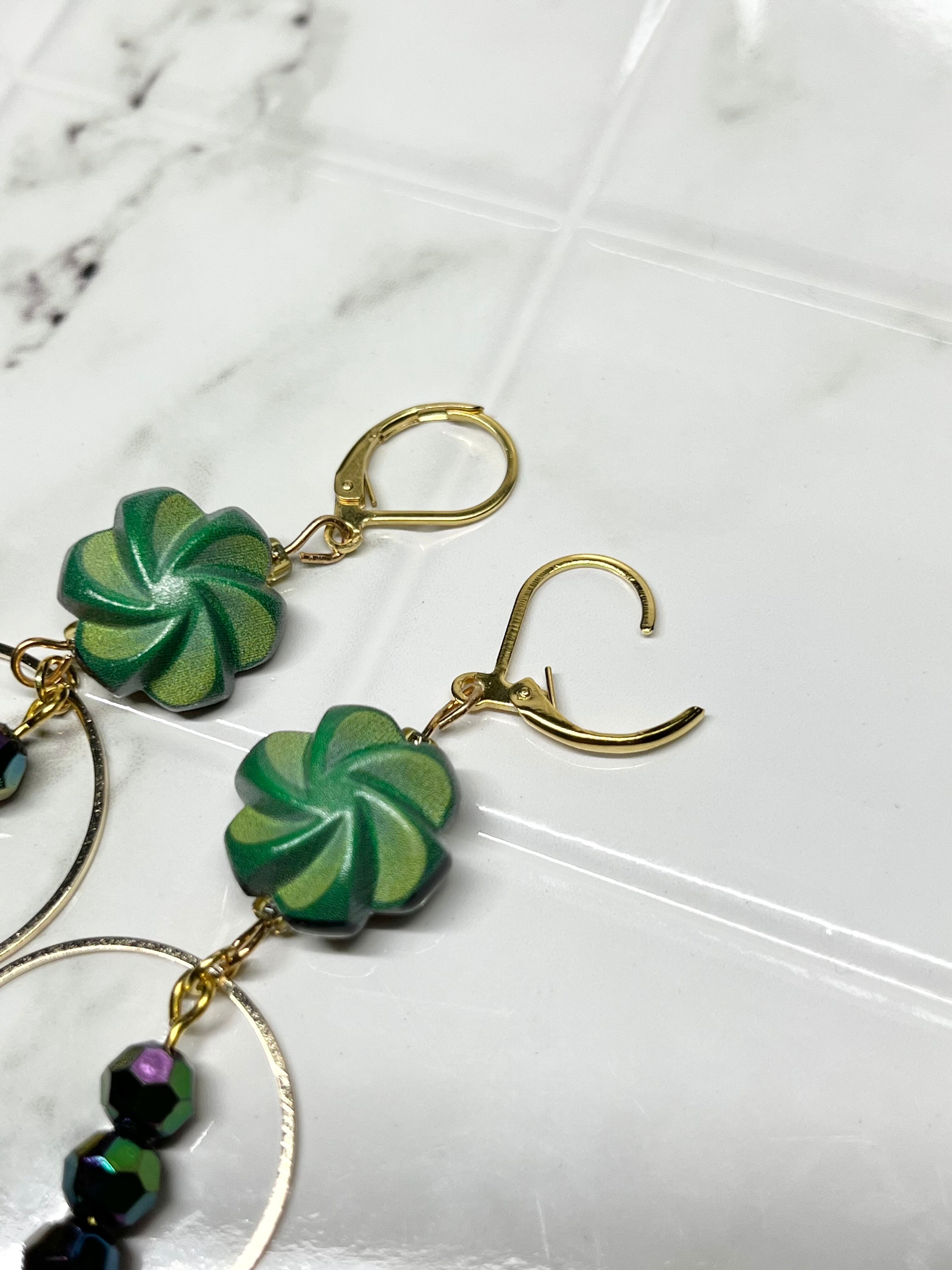 ◆グリーンのフラワーモチーフボタンとゴールドパーツで仕上げたピアス。