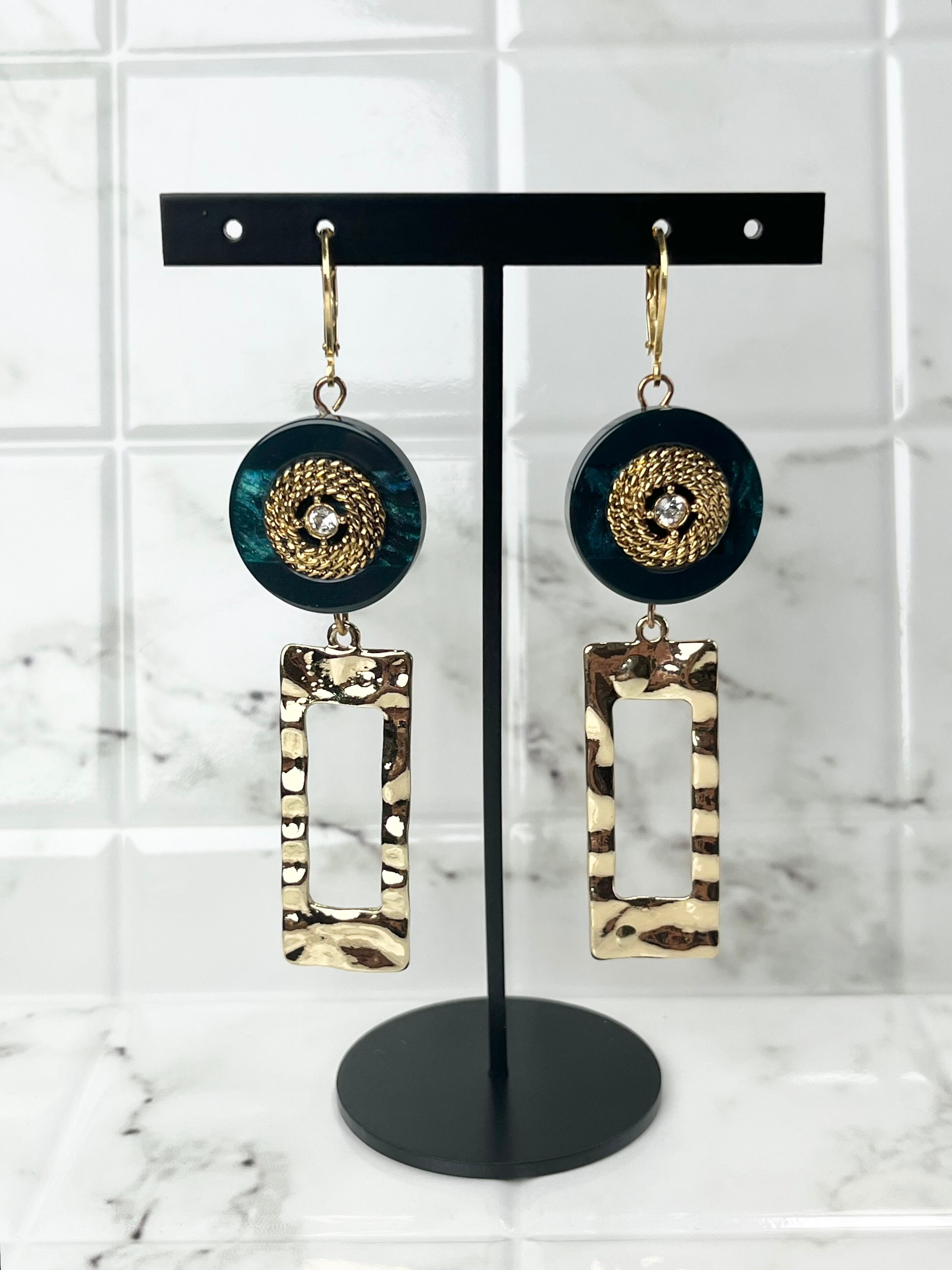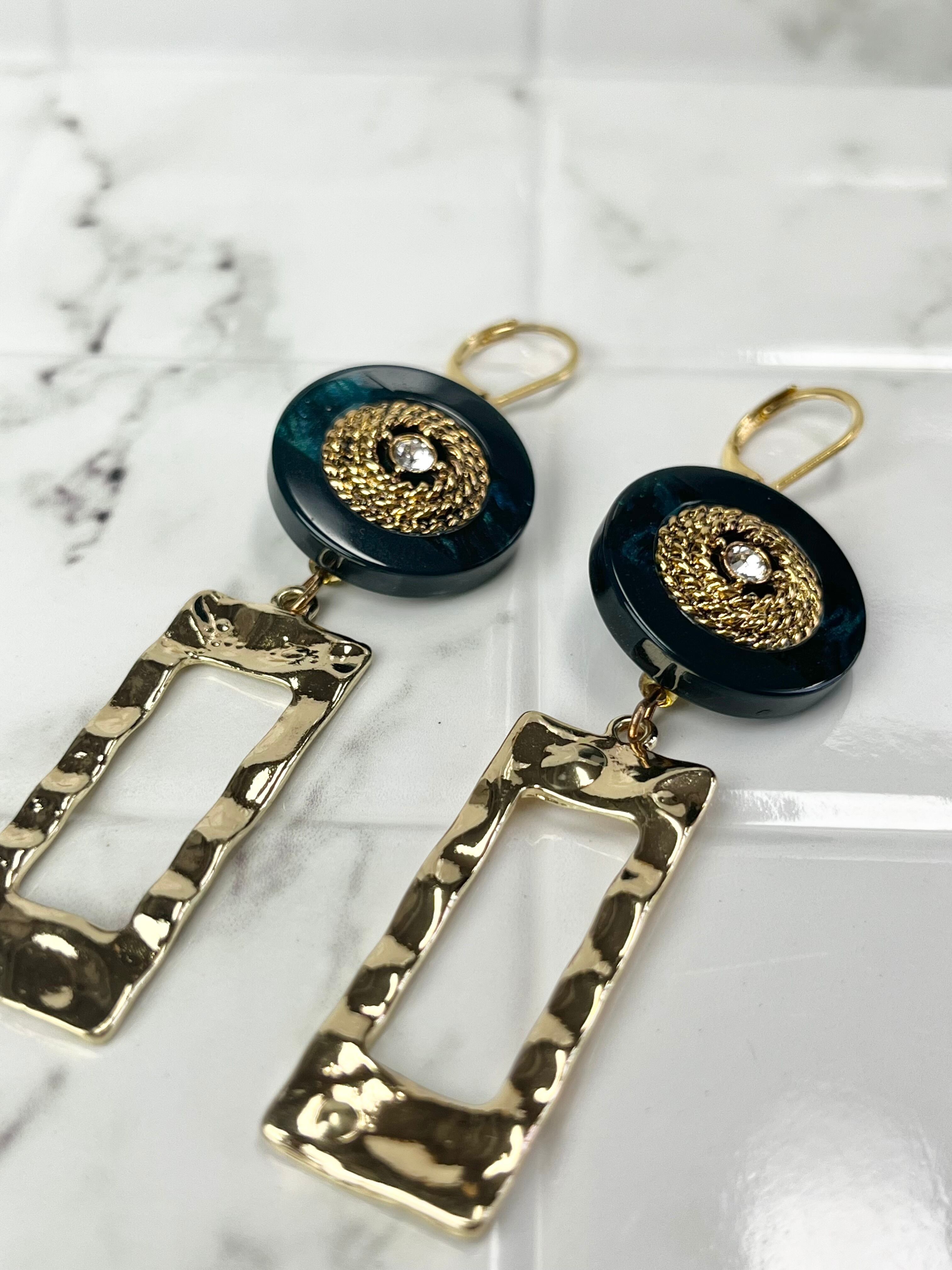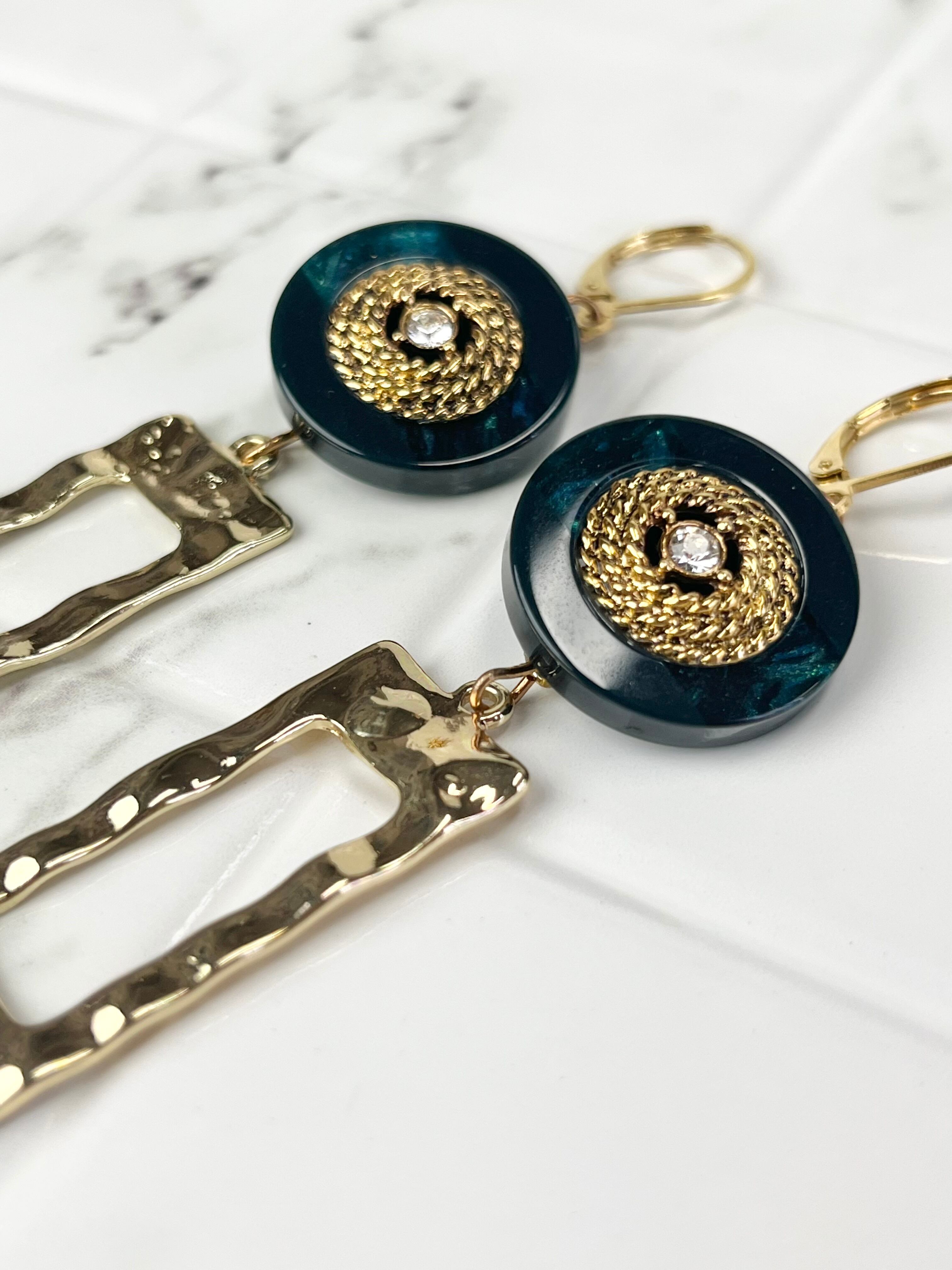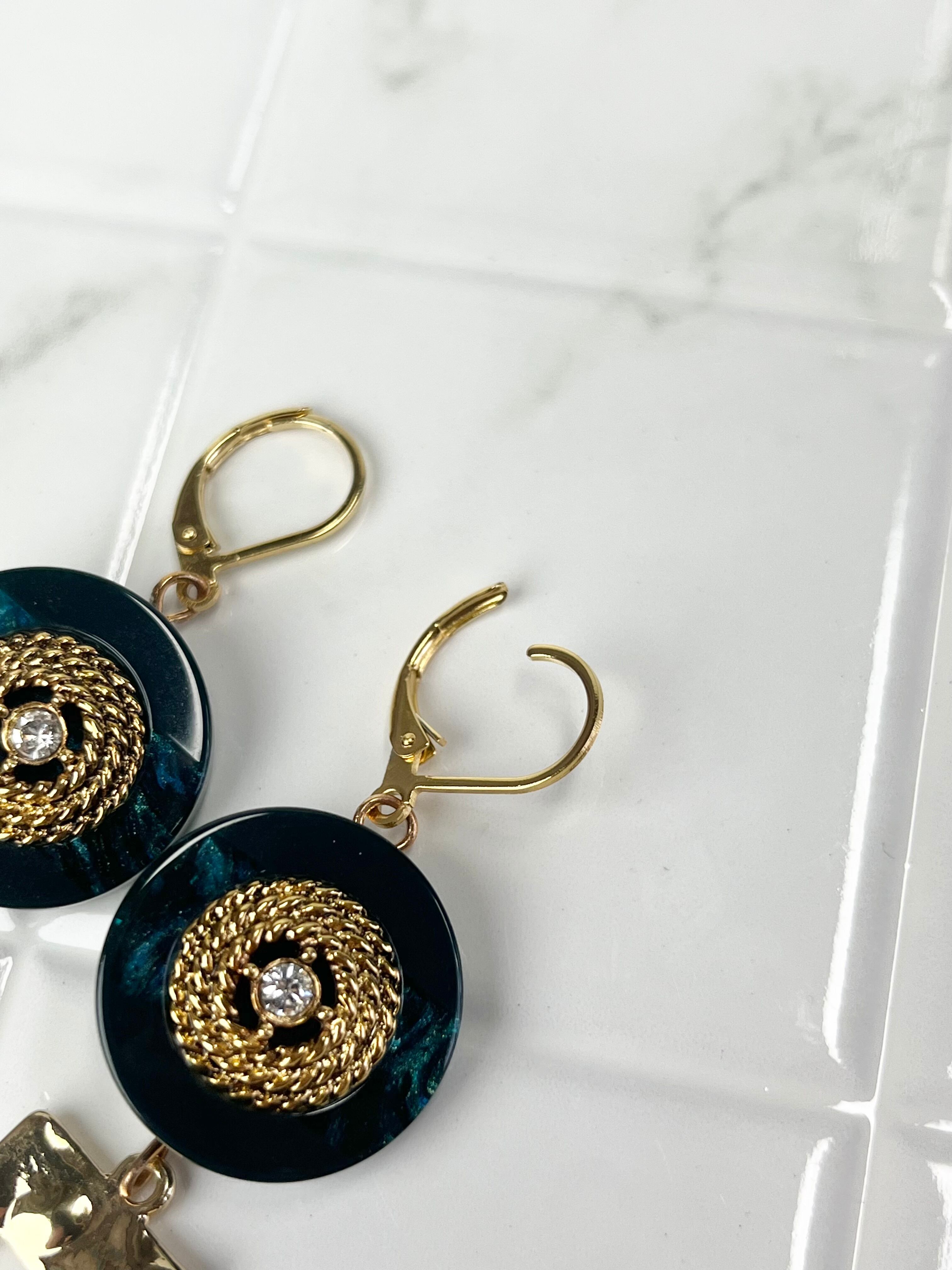 ◆深みのあるグリーン×ゴールドのボタンが主役のピアス。