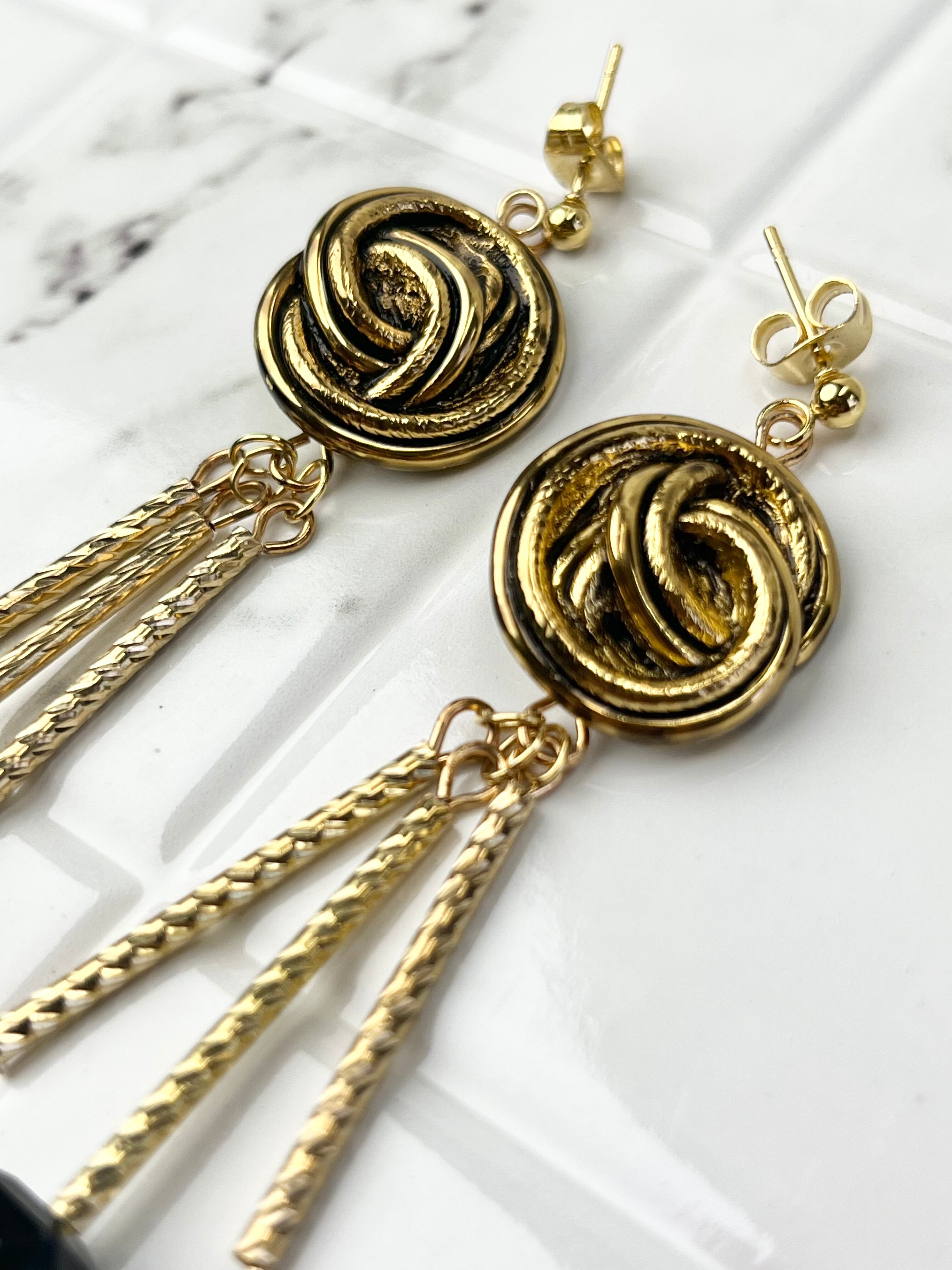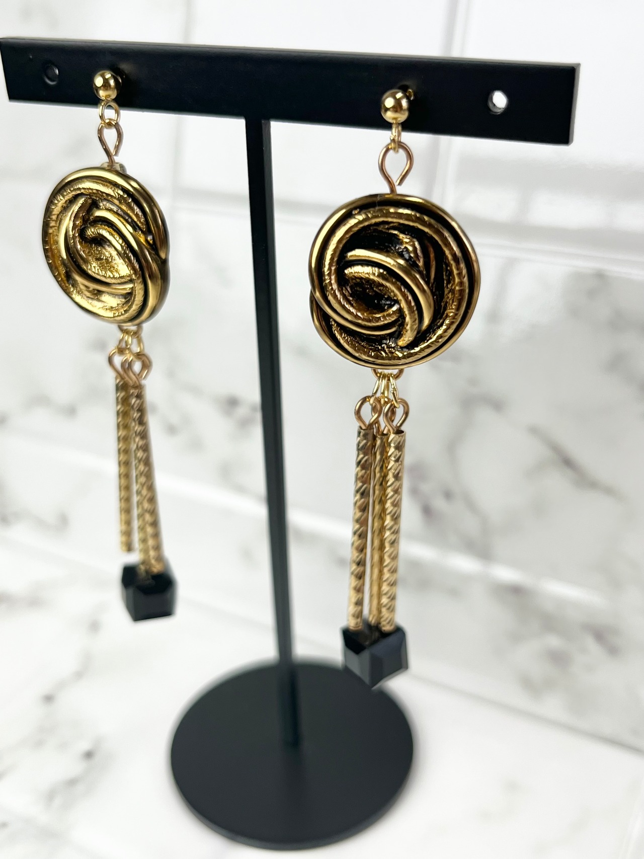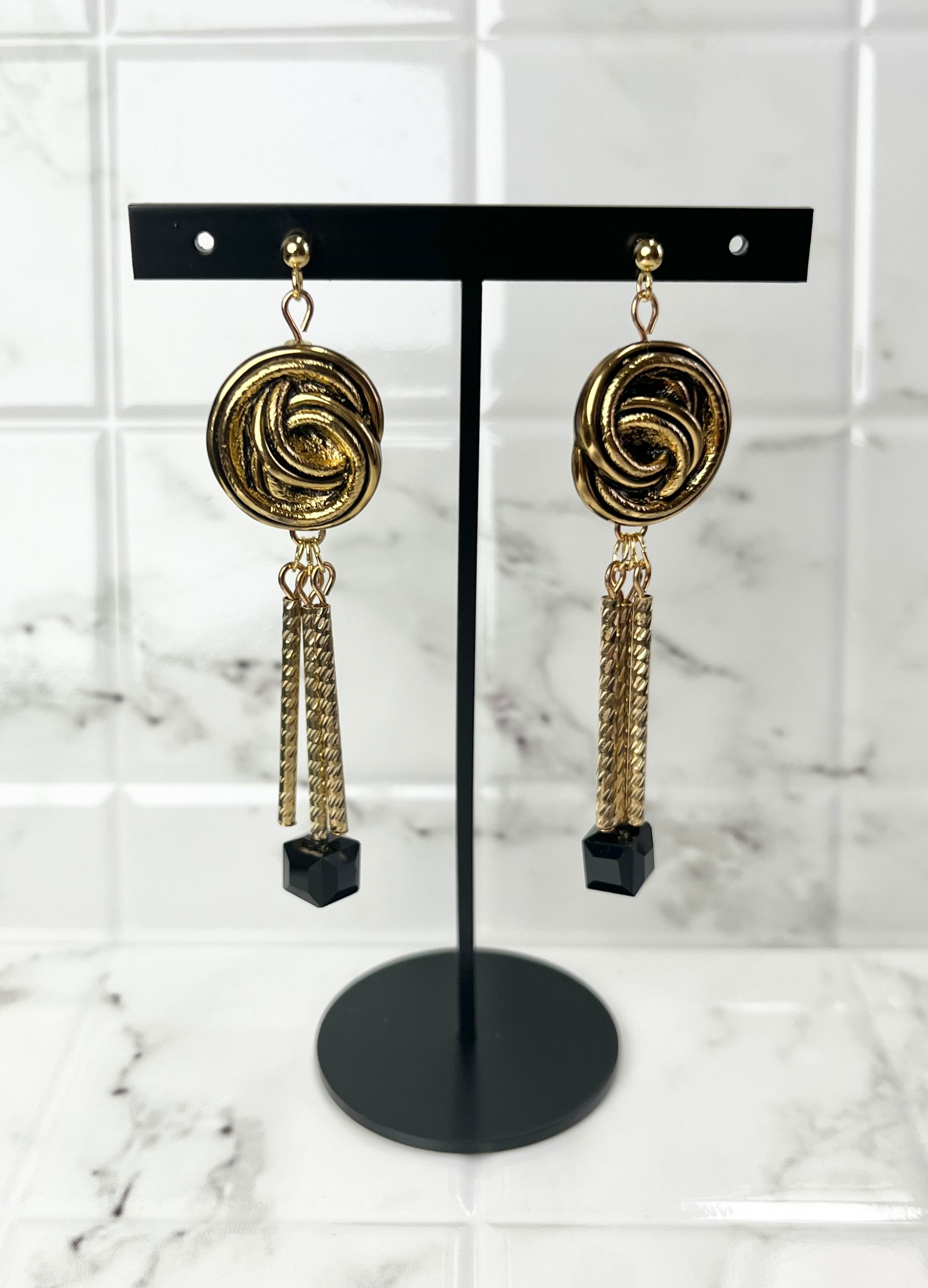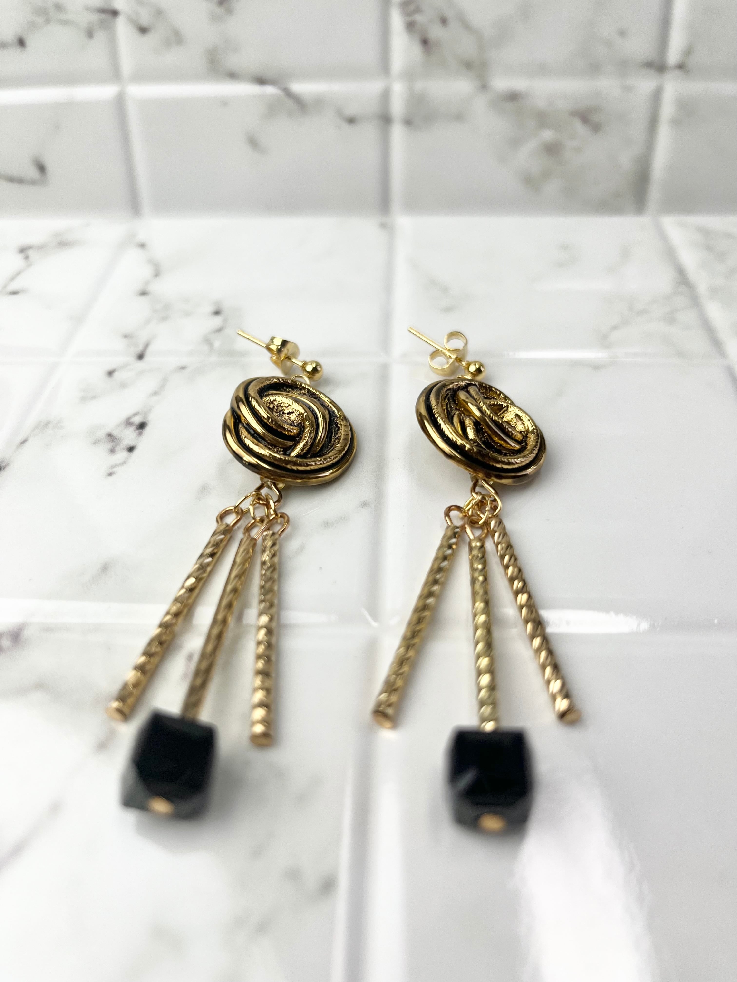 渦のようなボタンとパイプを組み合わせたデザインが特徴的なピアス。ゴールドカラーでまとめられたメタリックな雰囲気が、どんなコーディネートにも華やかさをプラスしてくれます。ブラックのスクエアビーズがアクセントになり、シンプルながらも存在感があります。