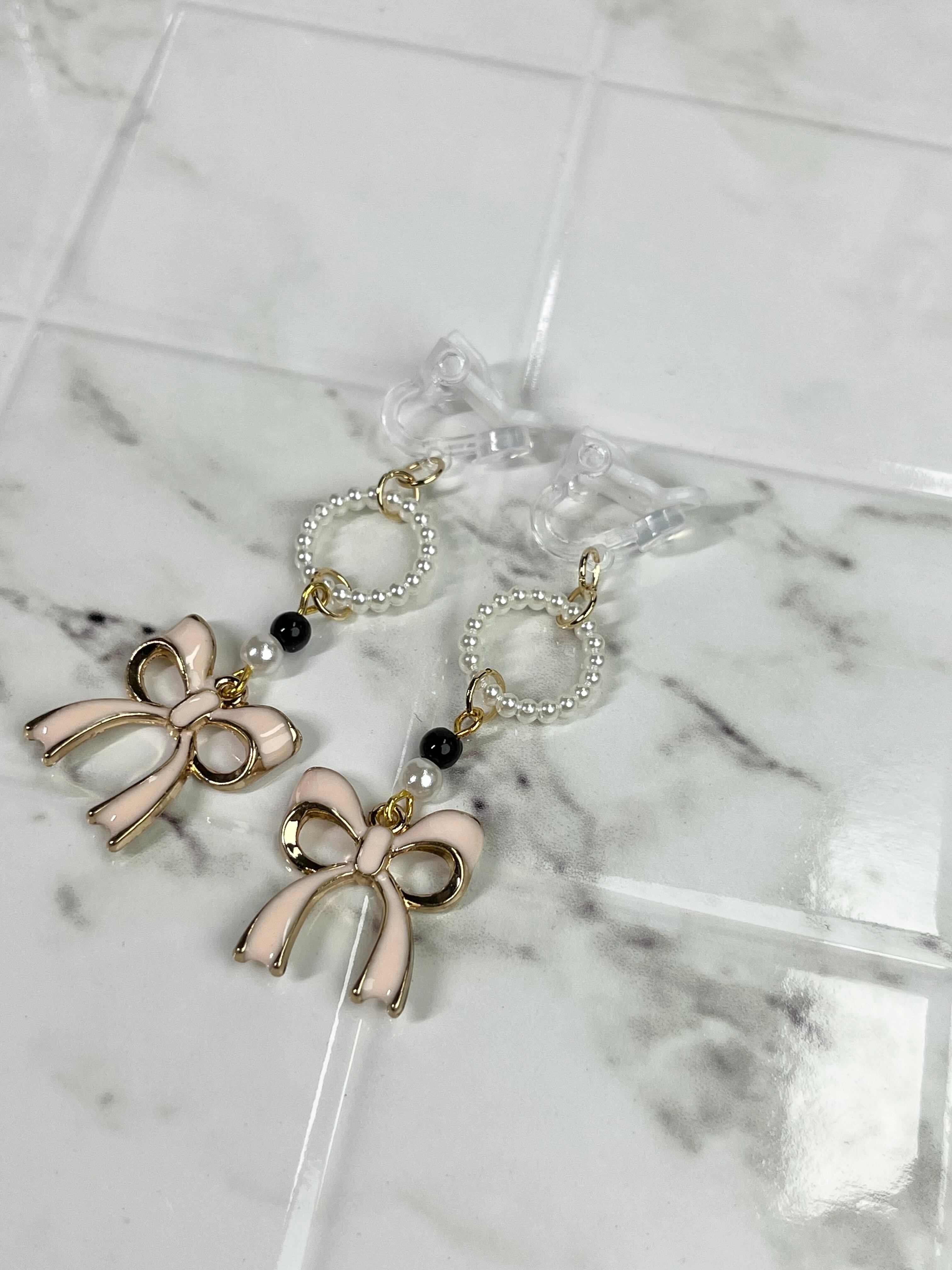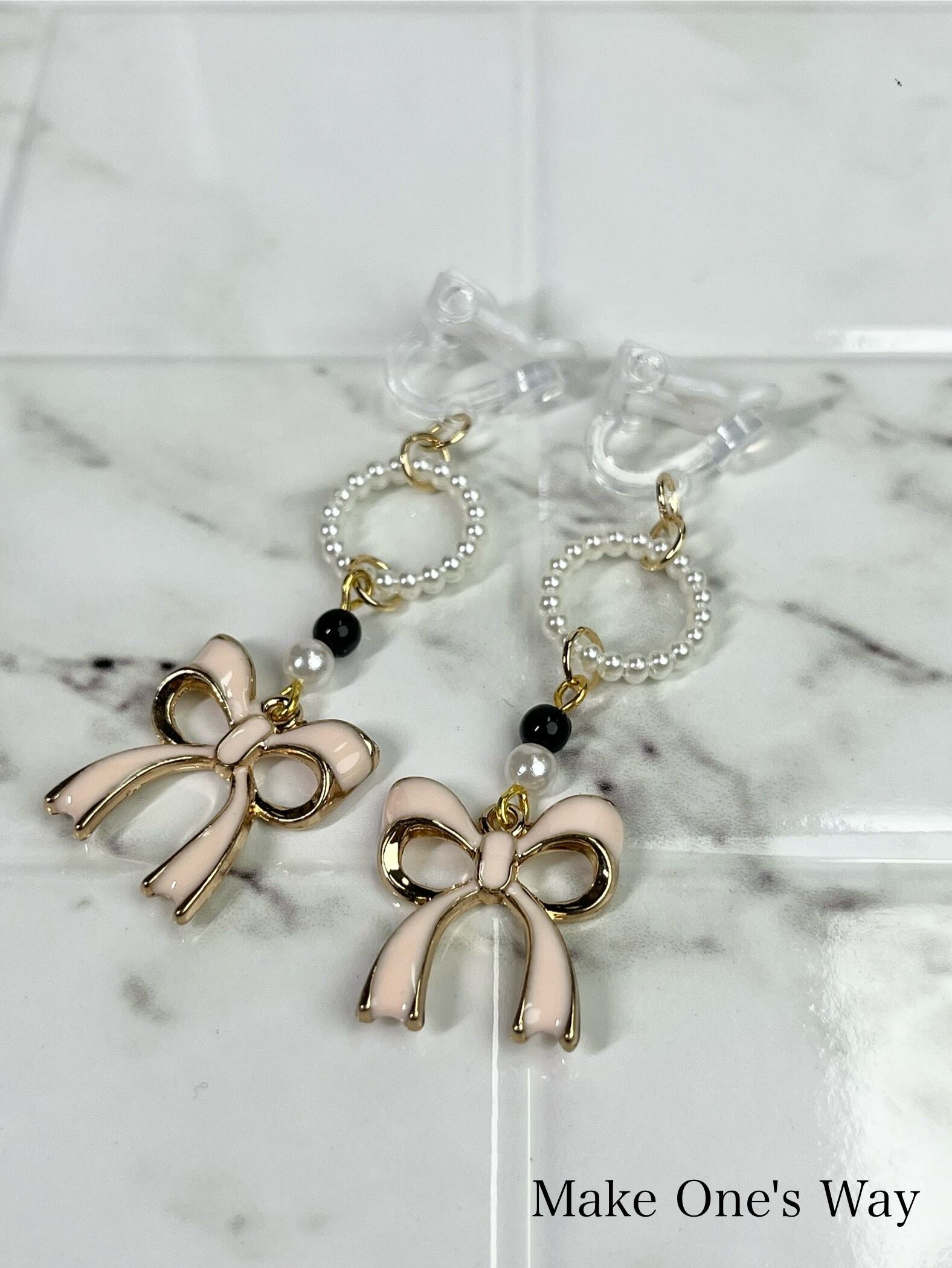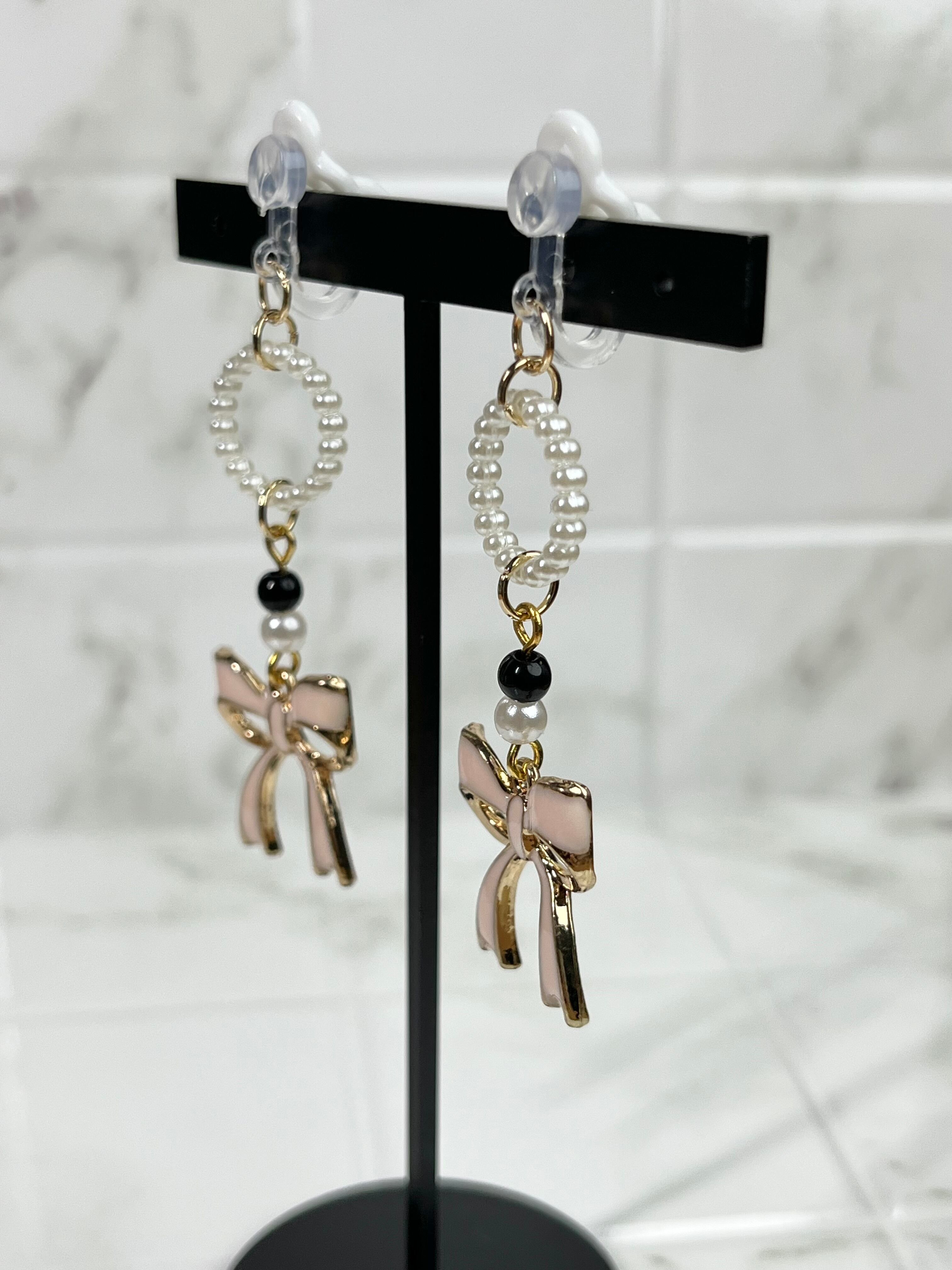 ◆淡いピンクのリボンとパール調リングを組み合わせたイヤリング。
