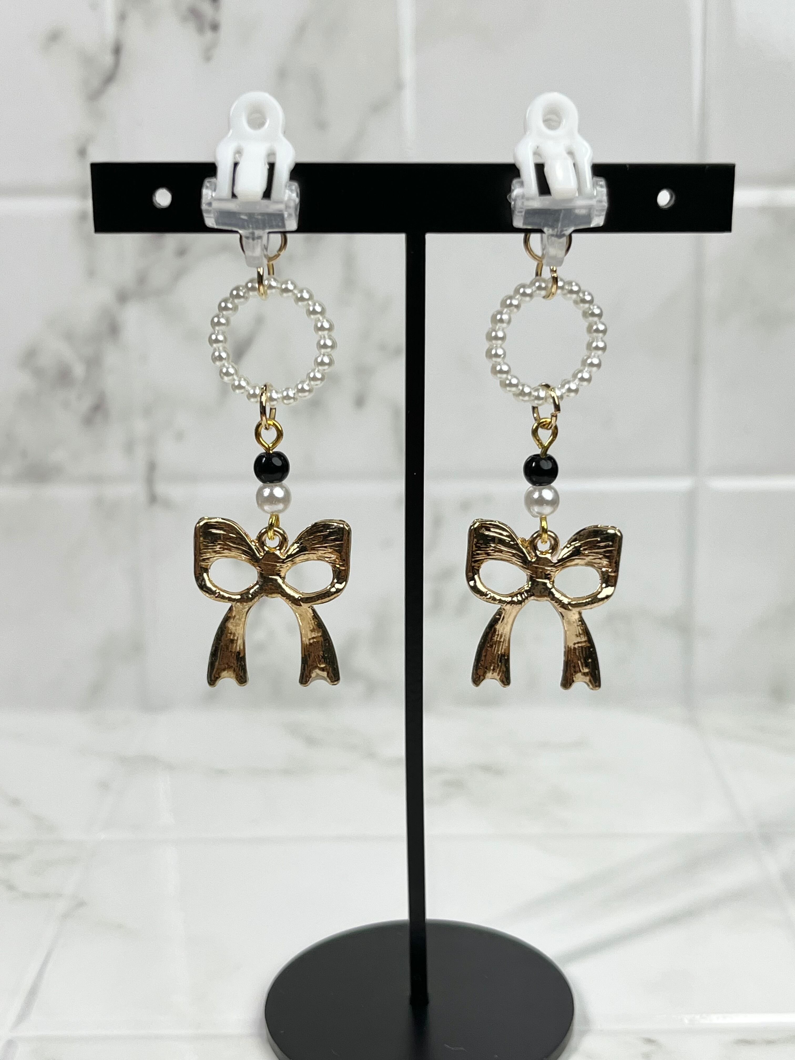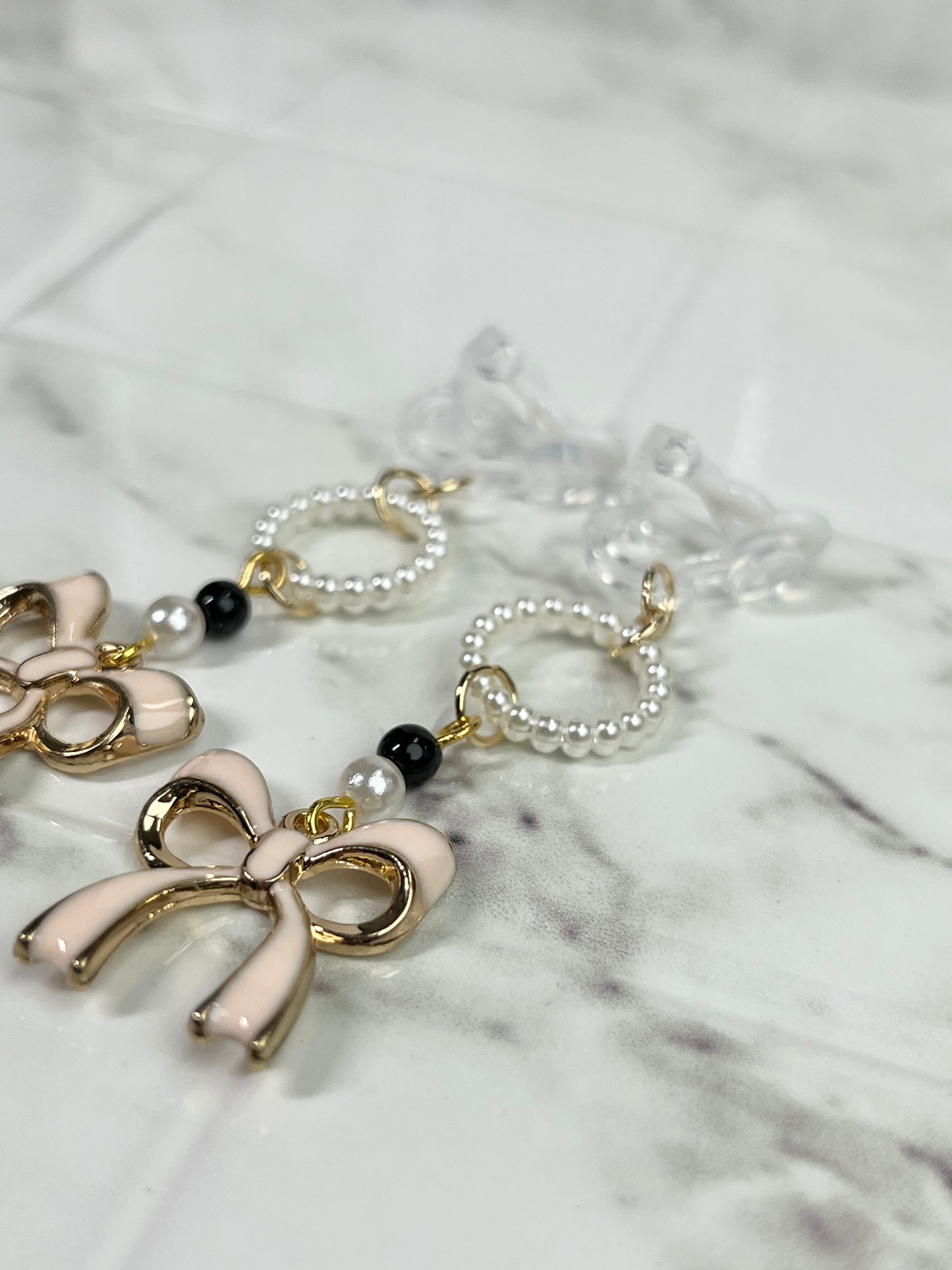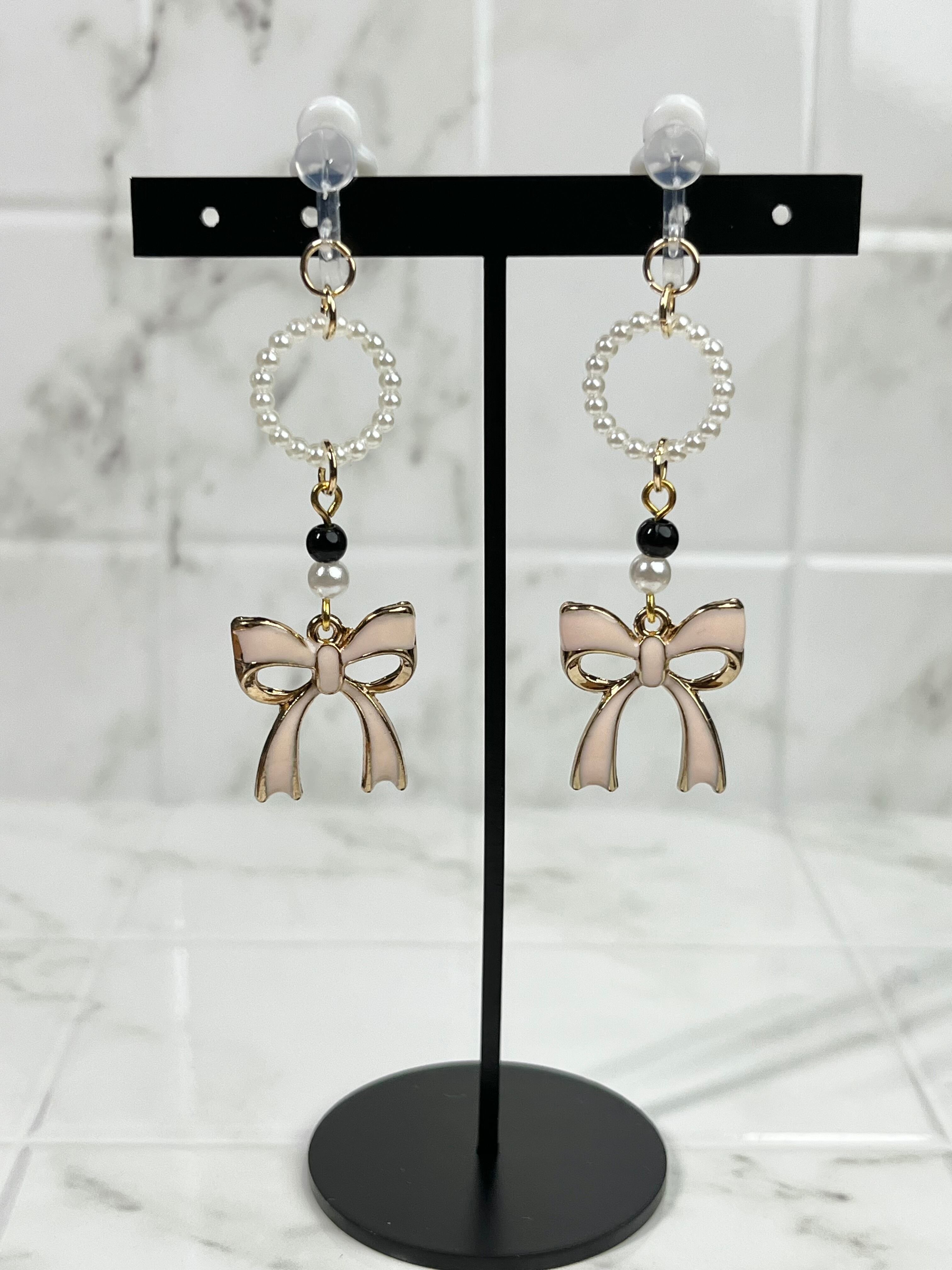 ◆淡いピンクのリボンとパール調リングを組み合わせたイヤリング。