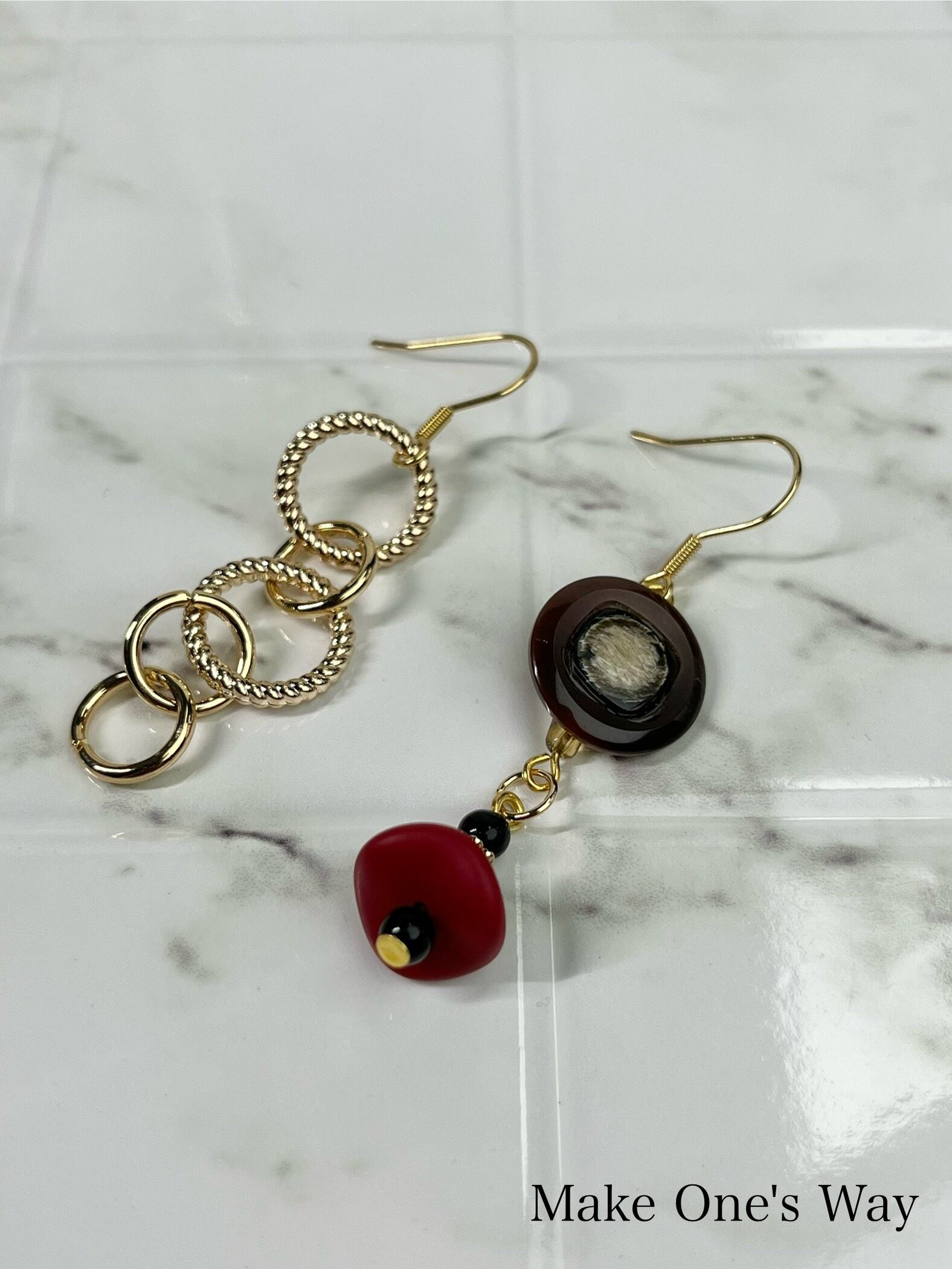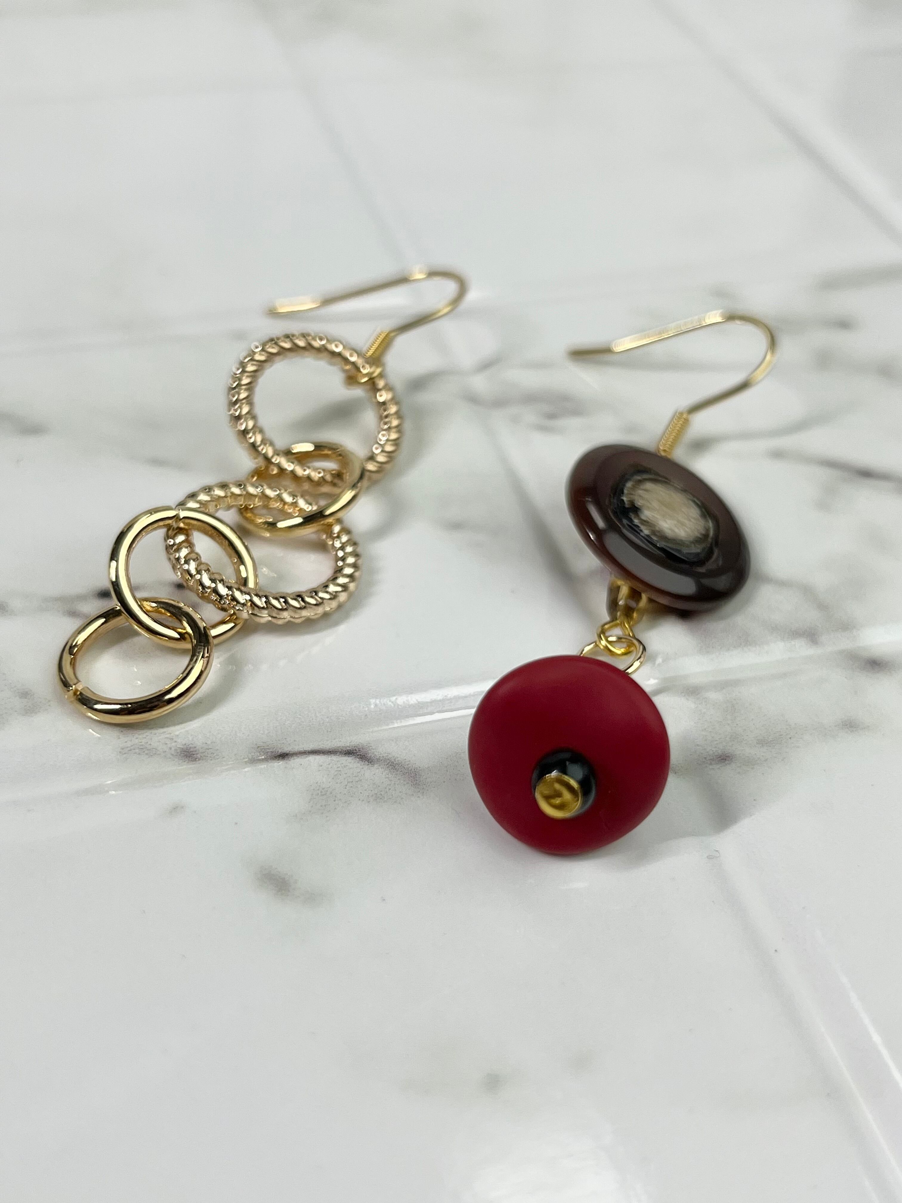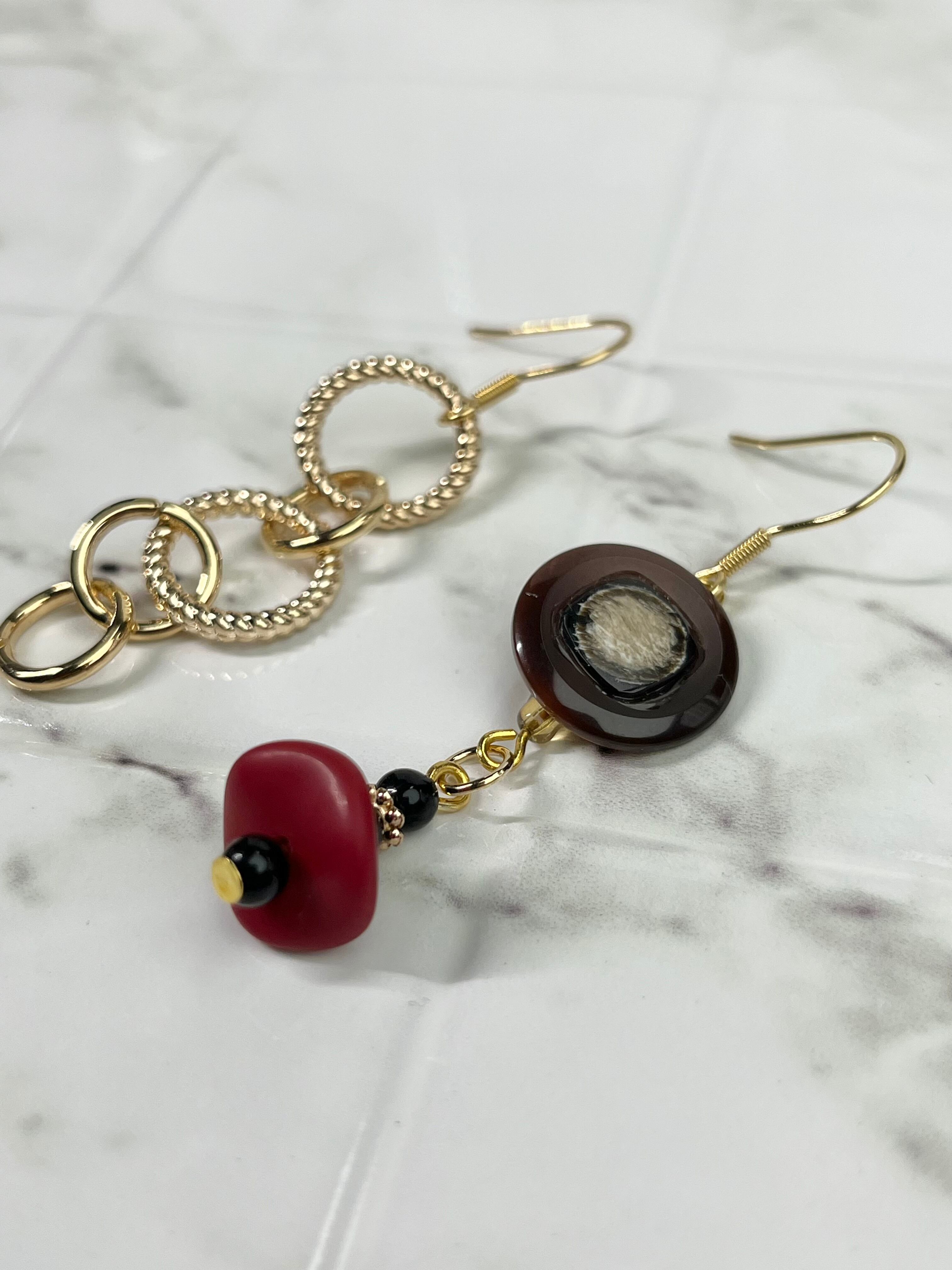 ◆レトロなデザインのボタンと紅色のチェコビーズをベースにゴールドパーツでまとめたアシンメトリーピアス。