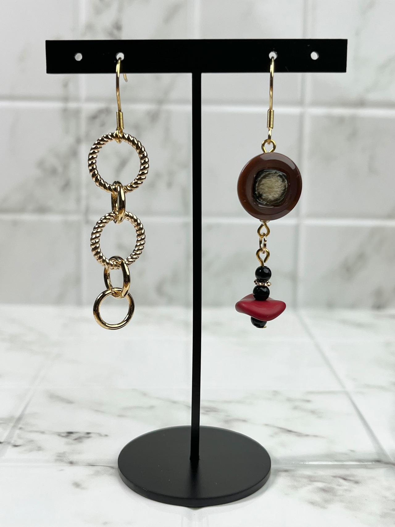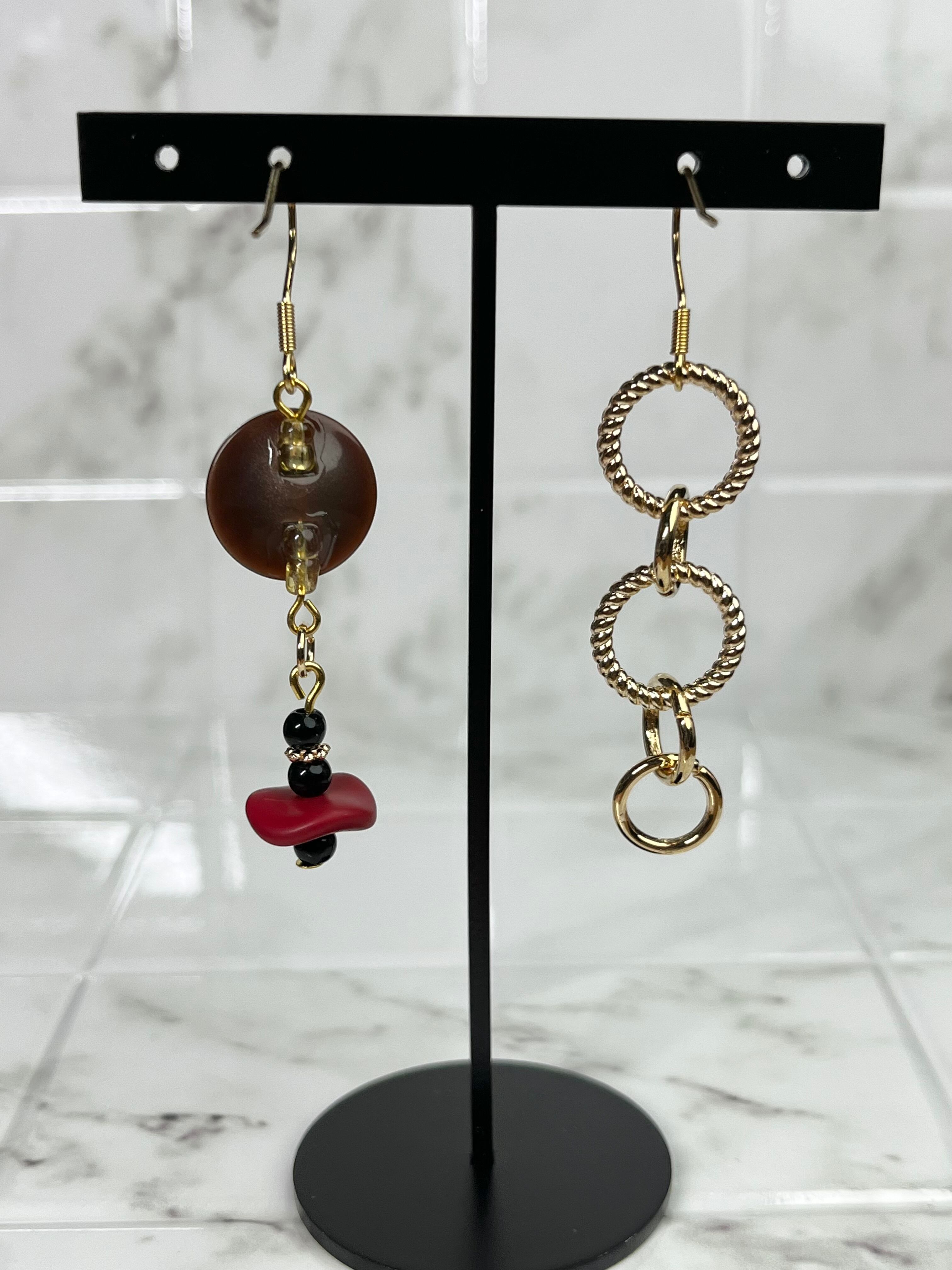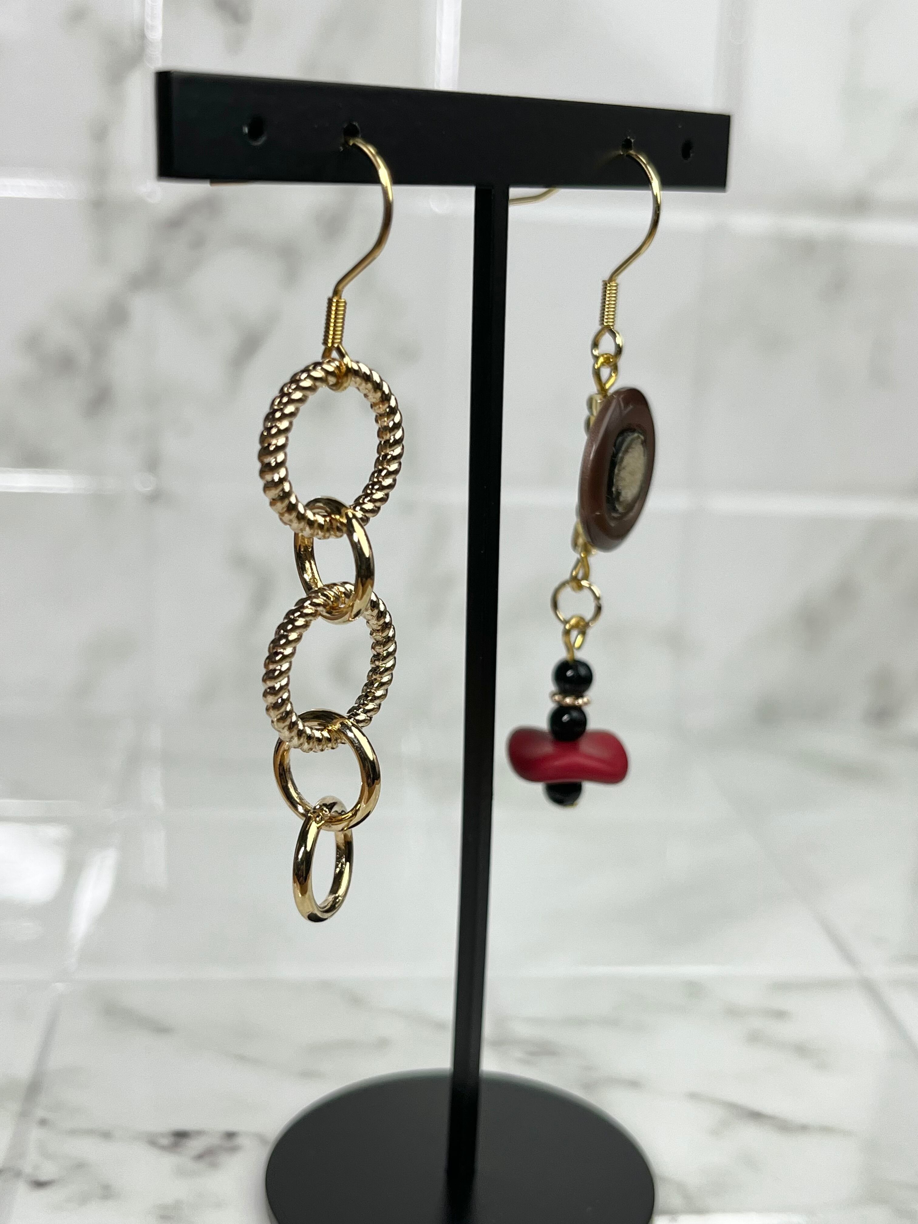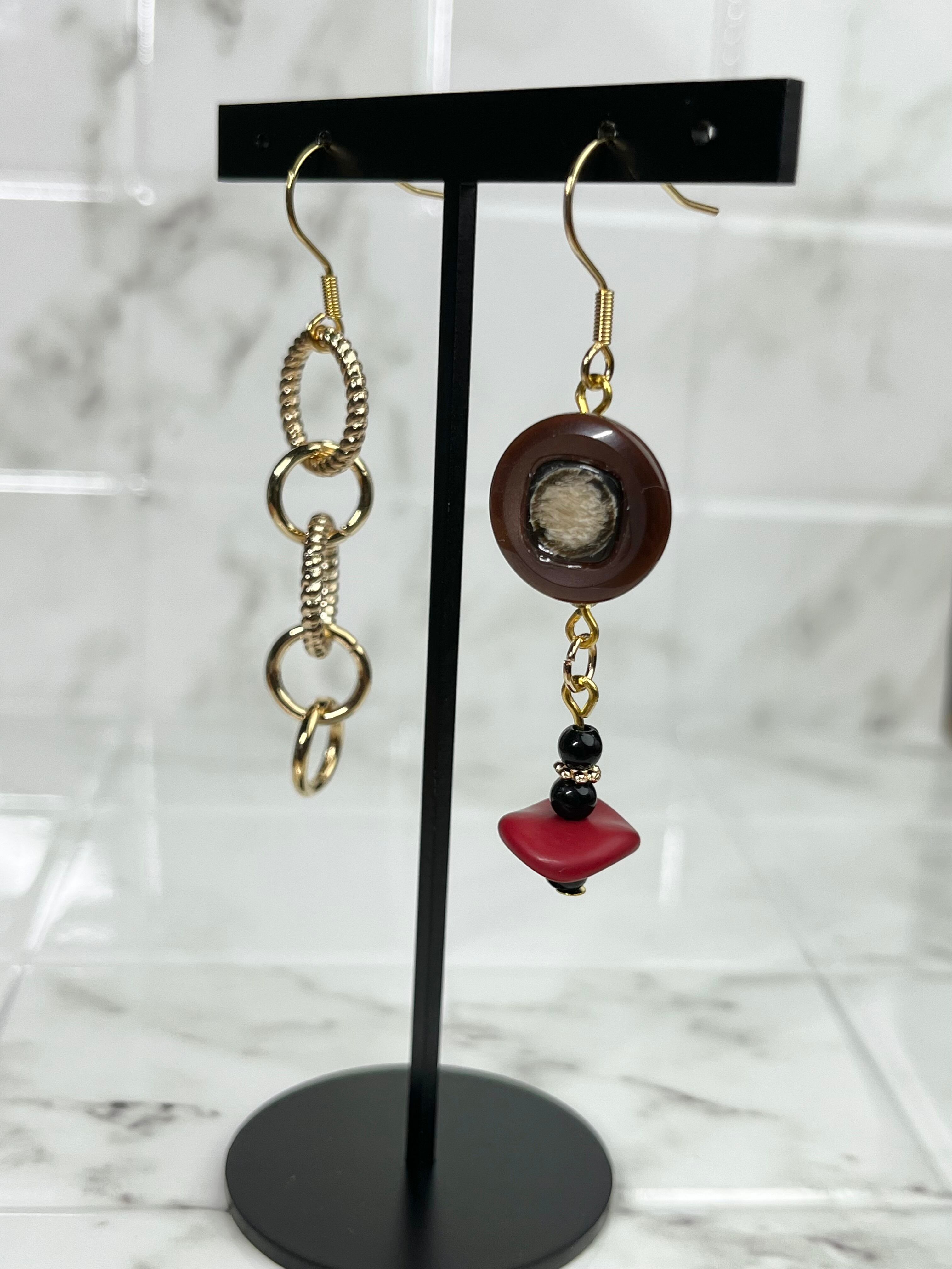 ◆レトロなデザインのボタンと紅色のチェコビーズをベースにゴールドパーツでまとめたアシンメトリーピアス。