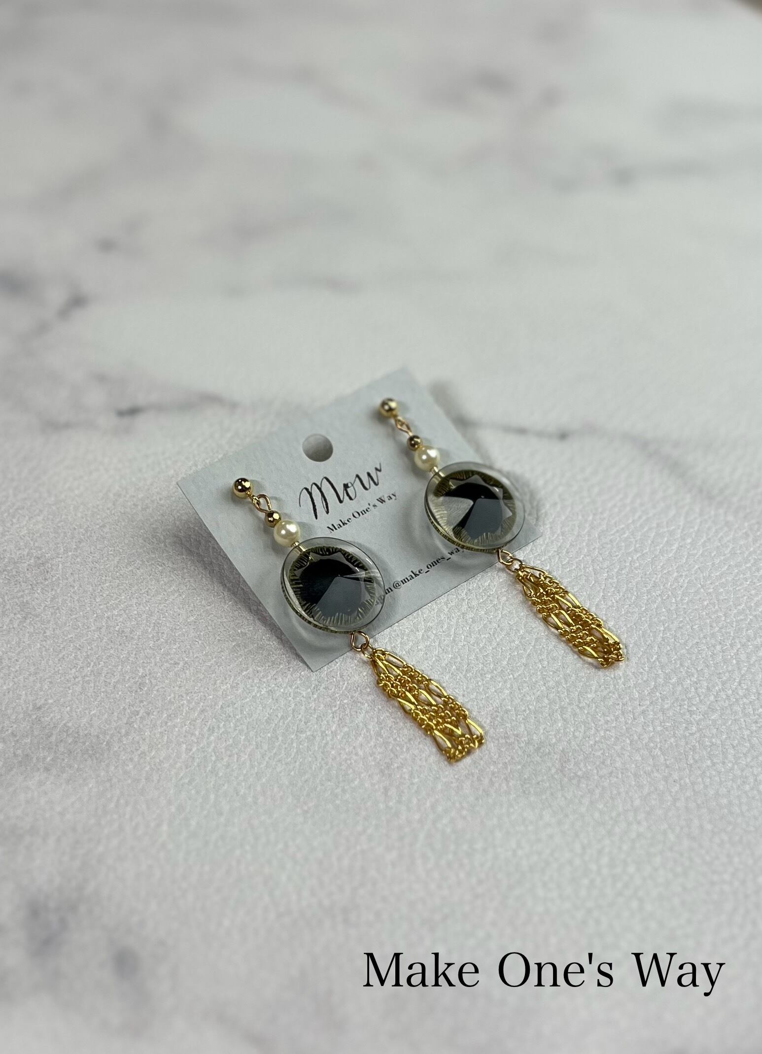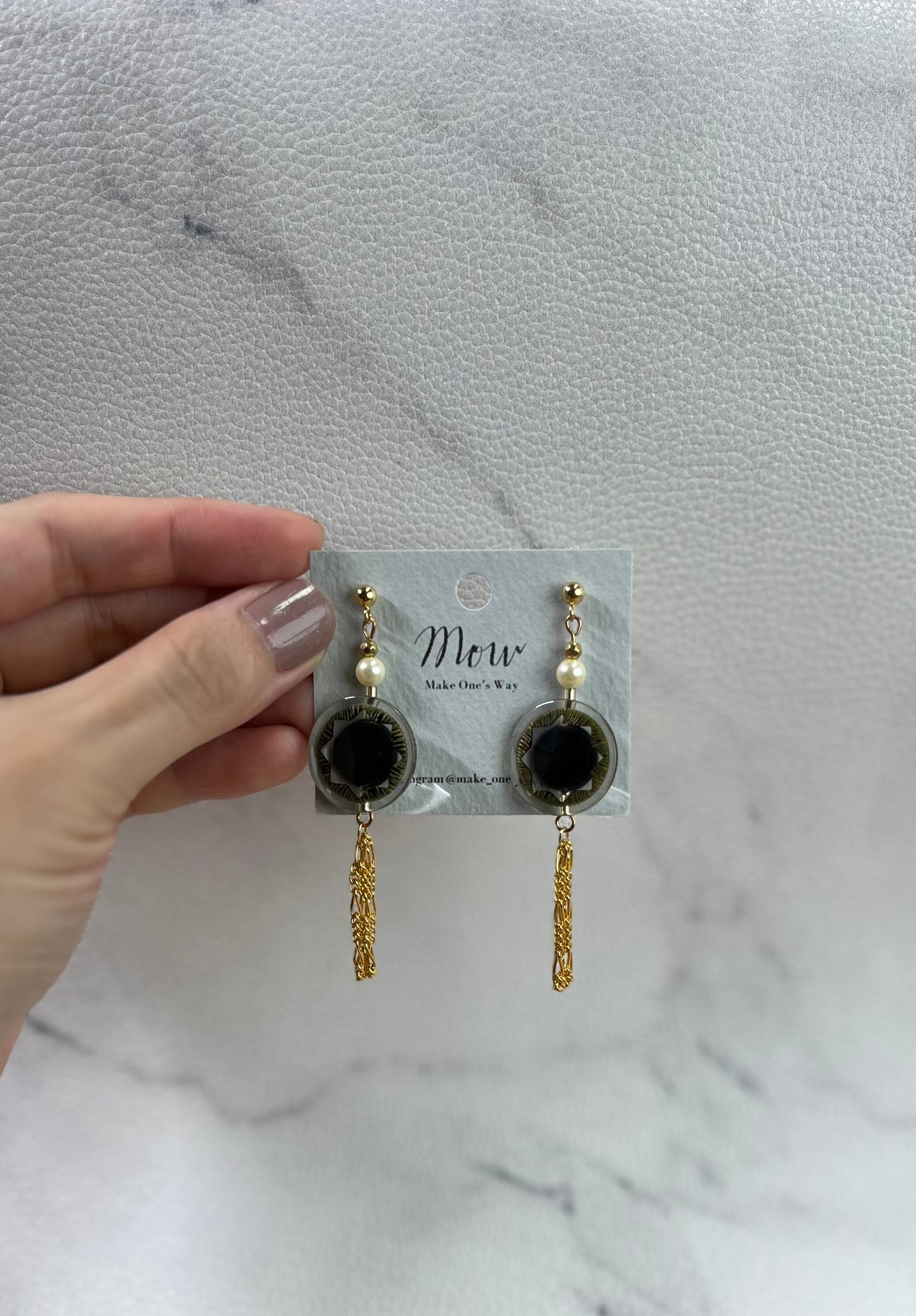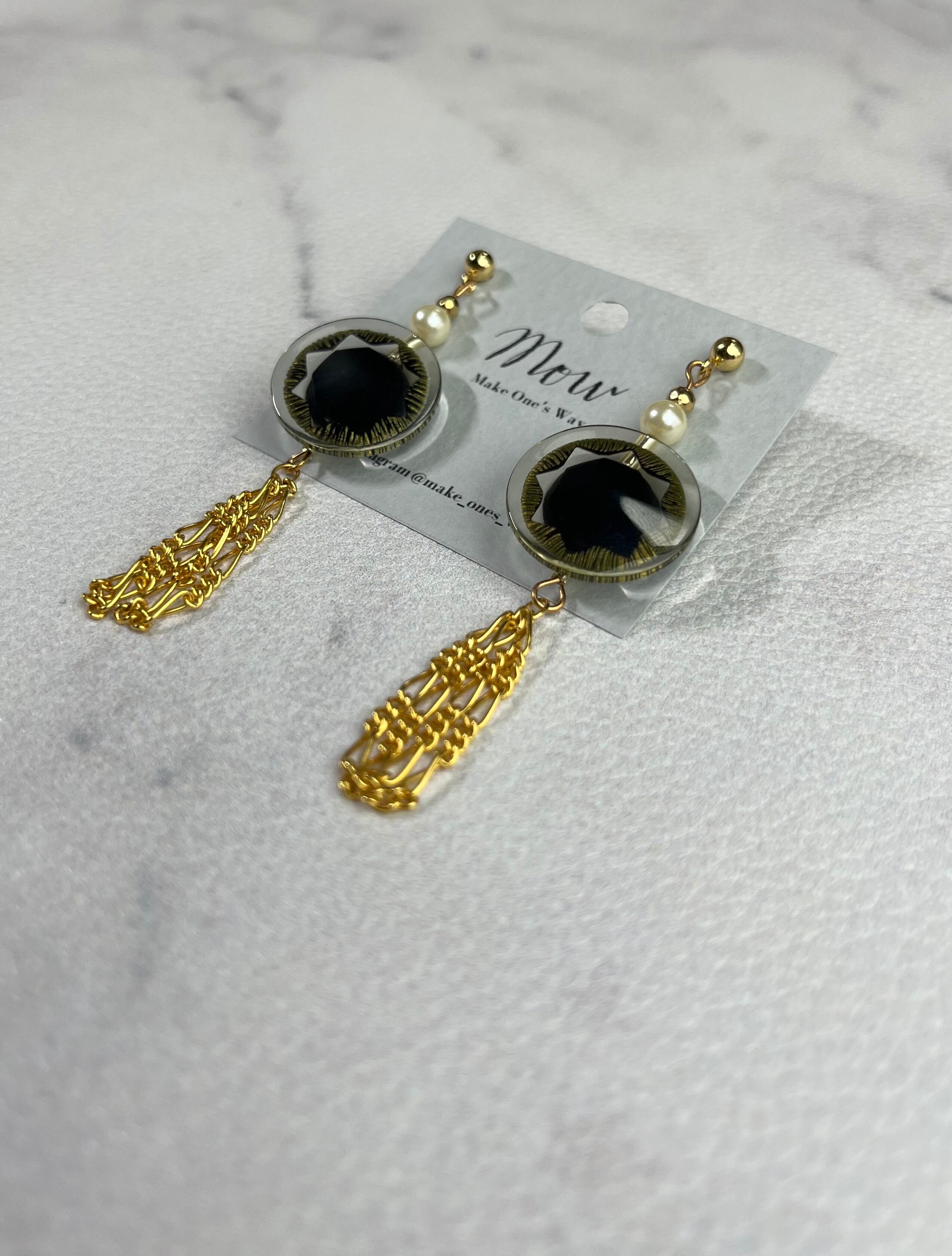 ◆ブラック×ゴールドのレトロボタンが主役のピアス。